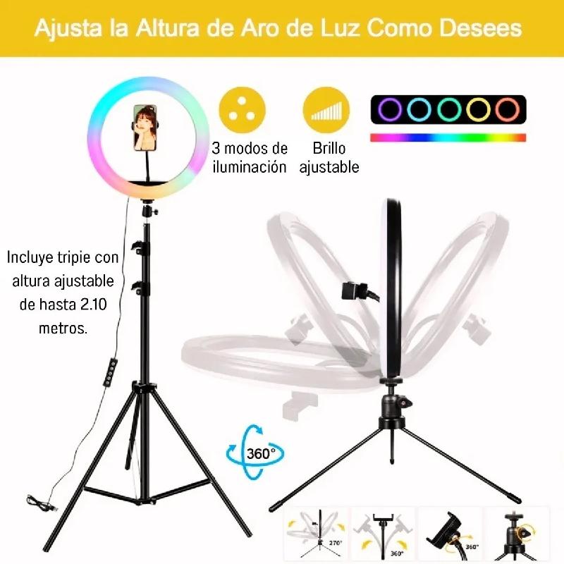 Gracias a este Aro de Luz podrás hacer tomas de alta calidad en cualquier sitio, tiene un diámetro de 33CM y también incluye el trípode de 2.1M. Puedes elegir entre luces cálidas, frías o de algún color en especifico.