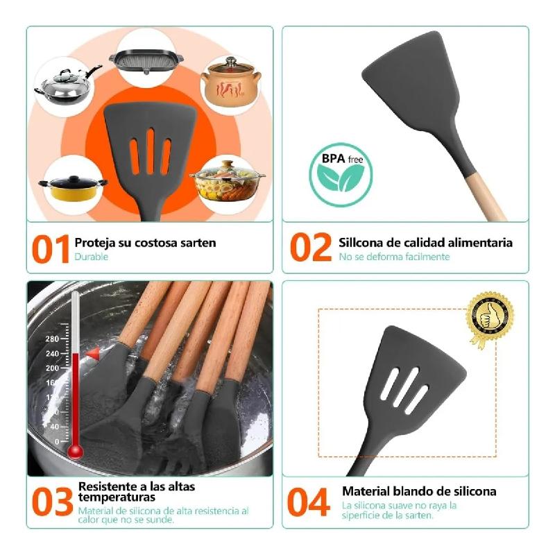 JUEGO DE UTENSILIOS DE COCINA EN SILICONA Y BAMBÚ SET DE 12 PIEZAS ANTIADHERENTE SIN BPA 230°C CON CONTENEDOR H1841