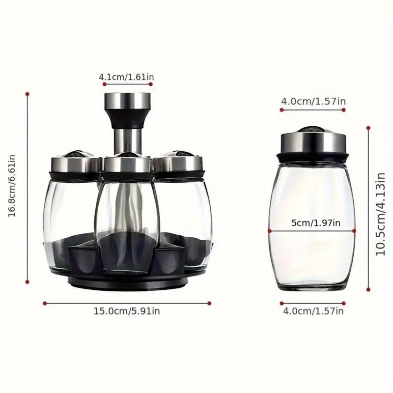 6 tarros de especias de vidrio: almacena hasta 6 especias diferentes, como sal, pimienta, cilantro, etc. Identificar fácilmente las especias del vidrio transparente. La tapa de cada frasco de vidrio está hecha de plástico.
