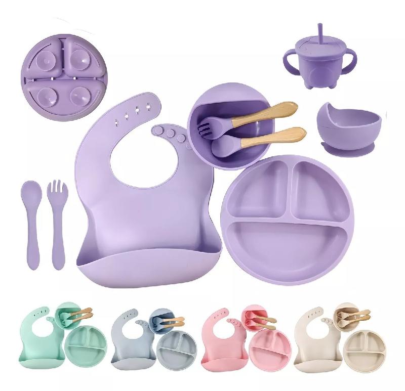 SET UTENSILIOS BEBE SILICONA ALIMENTACION X8 ANTIDERRAME SUCCION PLATO VASO BABERO BPA FREE SB18 H1017