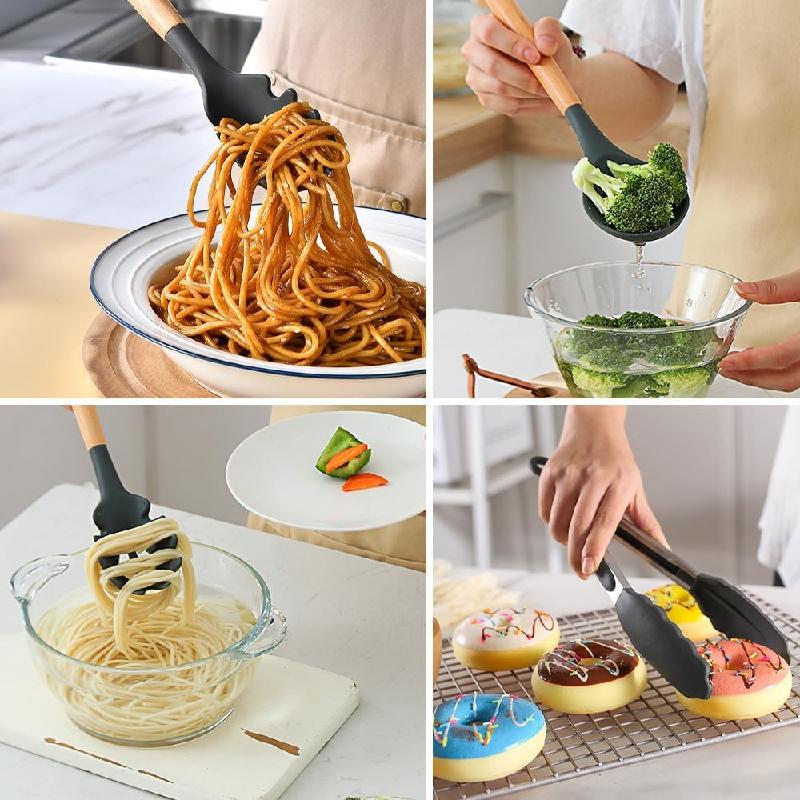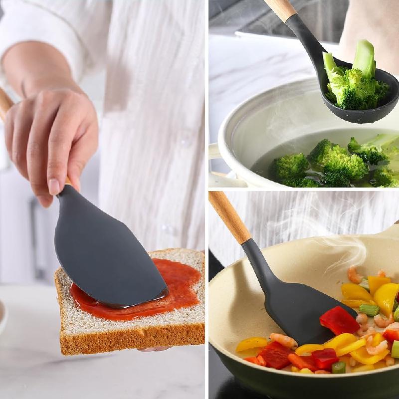 Hecho de silicona de grado alimenticio, sin BPA, se puede utilizar en cualquier tipo de alimento. Y probablemente durará más que los otros utensilios de cocina de plástico. Estos utensilios de cocina de silicona no reaccionan con alimentos o bebidas, no tienes que preocuparte por la salud de tus familias.