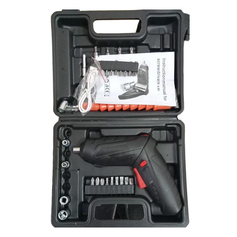 Incluye: varios accesorios (puntas de destornillador, etc.) y una maleta para un fácil almacenamiento y transporte.