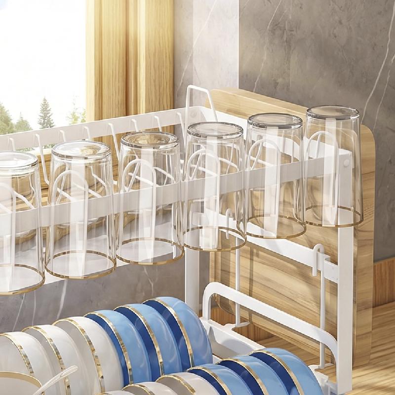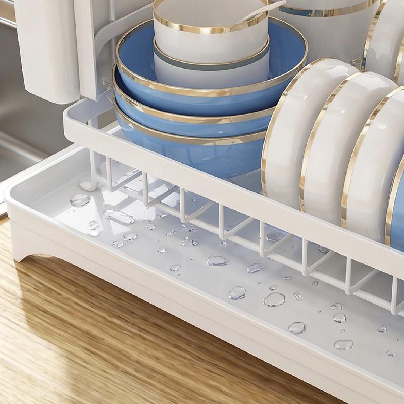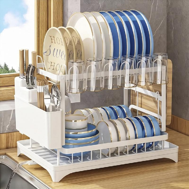 Uso eficiente del espacio: nuestro escurridor de platos de 2 niveles con escurridor maximiza el espacio de la cocina, lo que te permite secar platos, utensilios y utensilios de cocina cómodamente.