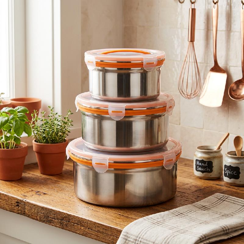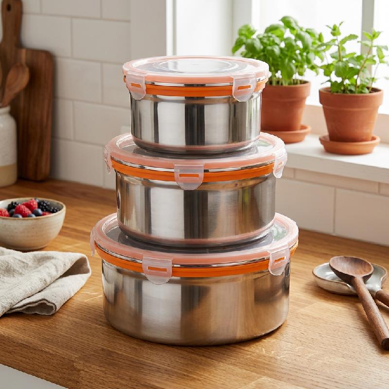 RECIPIENTES DE COMIDA EN ACERO INOXIDABLE REDONDOS X3 CON TAPA DE SILICONA PARA NEVERA LUNCH BOX F25223 C6 H3693
