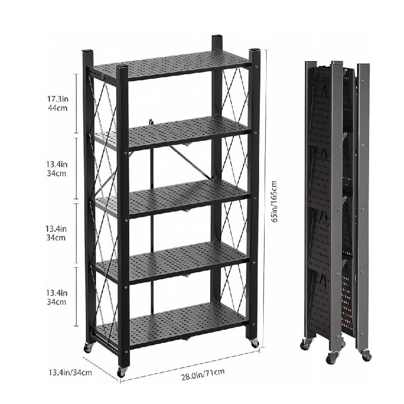 Plegable y ahorra espacio: el estante de almacenamiento está diseñado para ser plegable, lo que es conveniente para almacenar y transportar. Cuando no esté en uso, se puede plegar fácilmente y ponerlo en una esquina, ahorrando espacio en tu hogar o cochera.