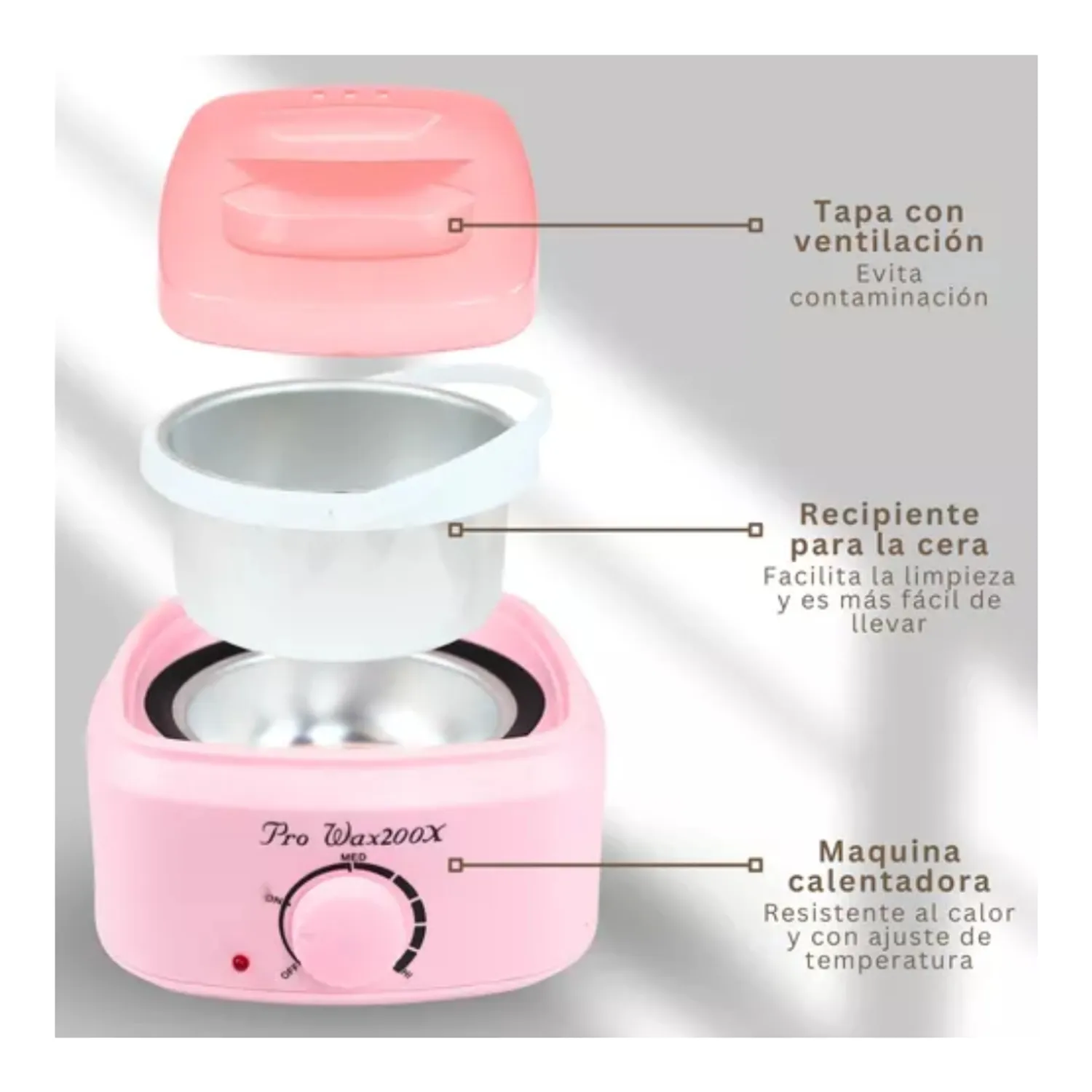 Fabricado con un pote de cera de metal y un fundidor de plástico, este calentador asegura una distribución uniforme del calor, lo que permite una aplicación suave y efectiva.