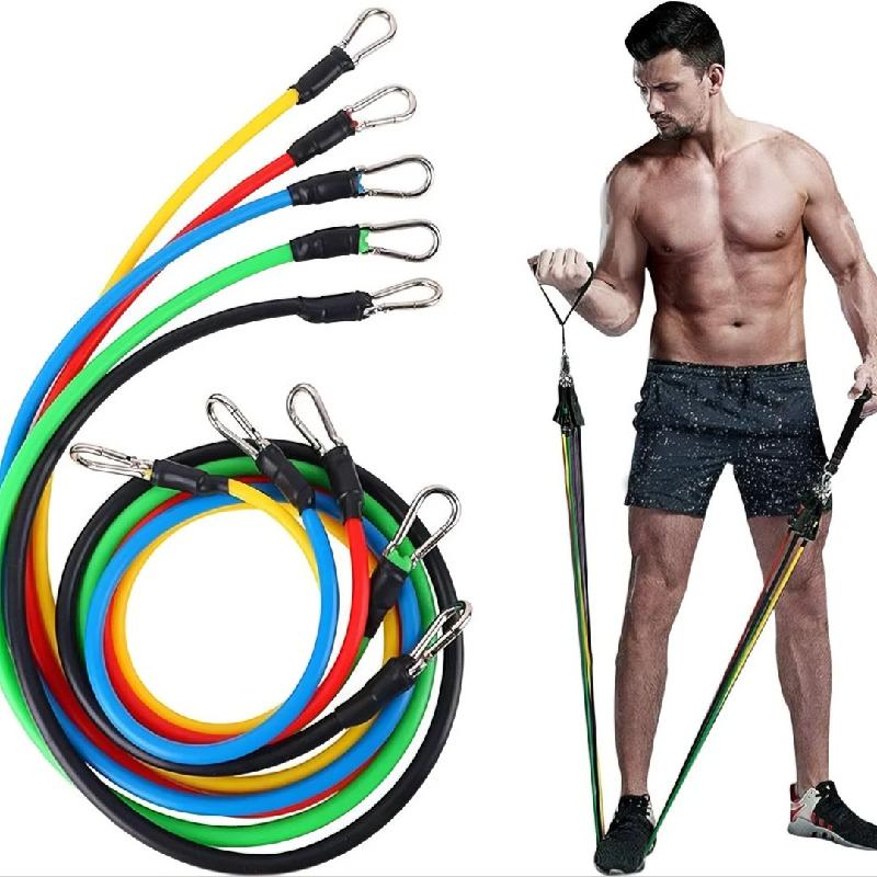Este set incluye 5 bandas de 130 cm de largo, cada una con diferente color y nivel de resistencia para adaptarse a distintos objetivos de entrenamiento: amarillo (muy suave, 6-8 lbs), verde (suave, 9-11 lbs), rojo (medio, 12-15 lbs), azul (fuerte, 16-20 lbs) y negro (muy fuerte, 21-25 lbs).