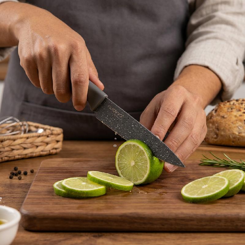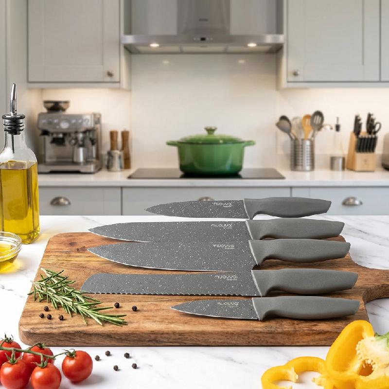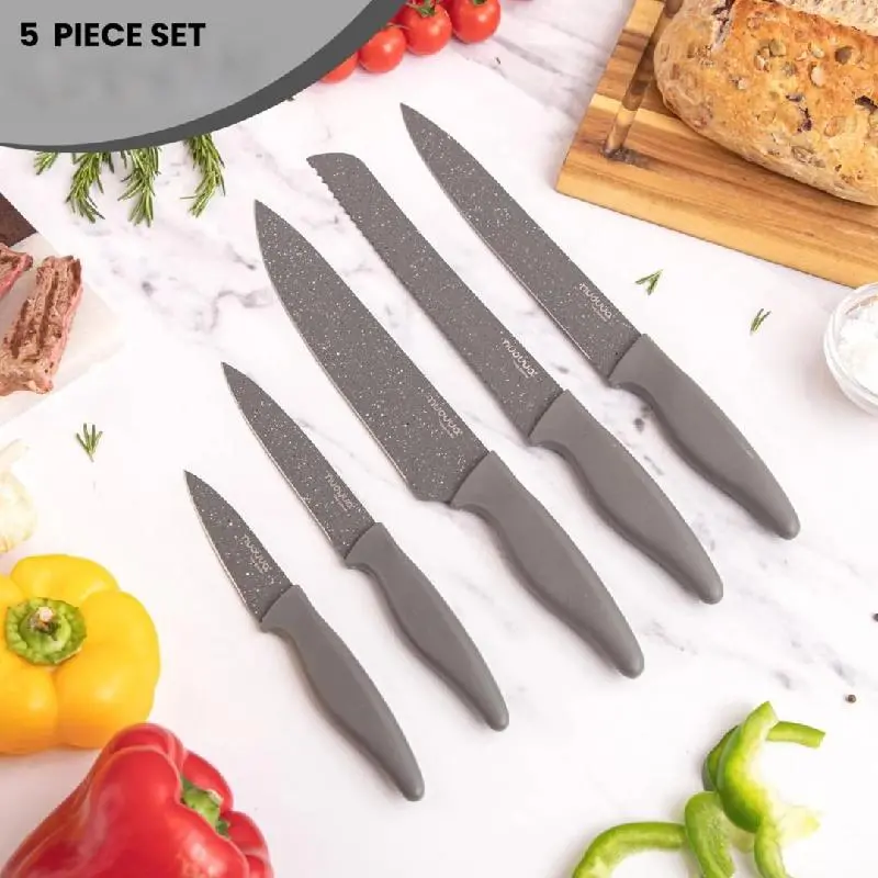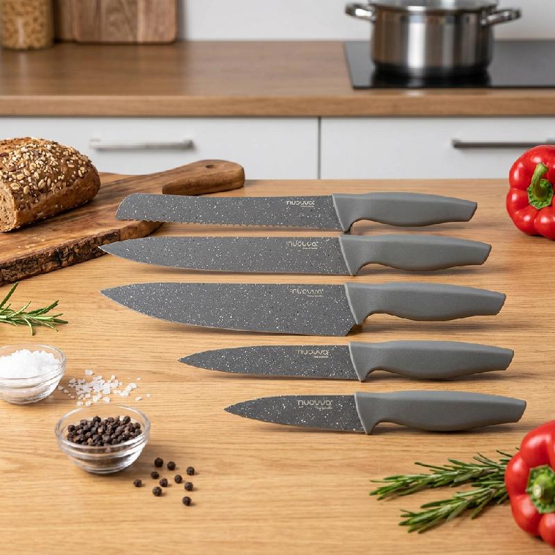 Set de 5 cuchillos de cocina con mango gris texturizado y hoja gris con salpicado blanco (acabado tipo granito).