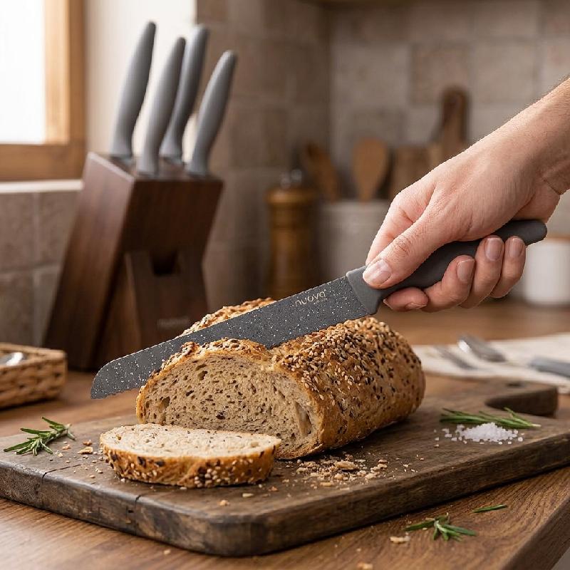 Incluye: cuchillo chef grande, cuchillo panero dentado, cuchillo fileteador o de trinchar, cuchillo multiusos y cuchillo pequeño pelador (por el tamaño y forma de las hojas).