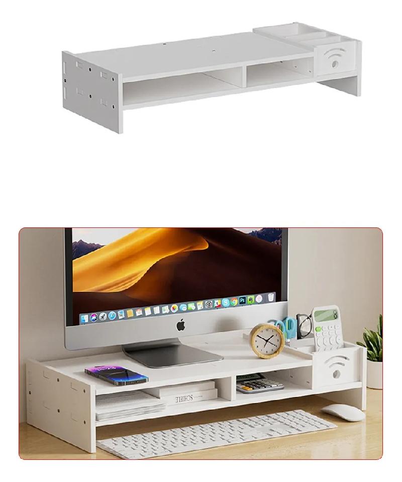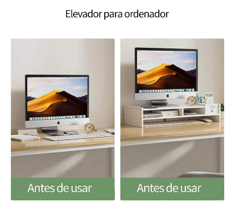 Soporte elevador para monitor: el soporte elevador para monitor viene con varios compartimentos para guardar fácilmente artículos de papelería, documentos y objetos pequeños. Robusto y estable: el diseño robusto y estable del soporte elevador de monitor es adecuado para ordenadores de escritorio de varios tamaños y pantallas.