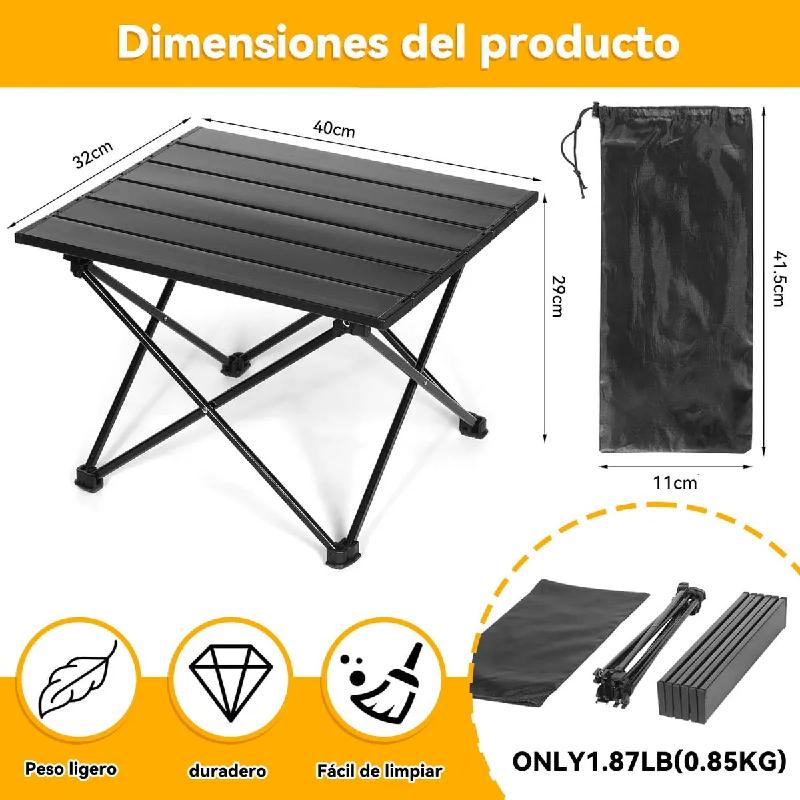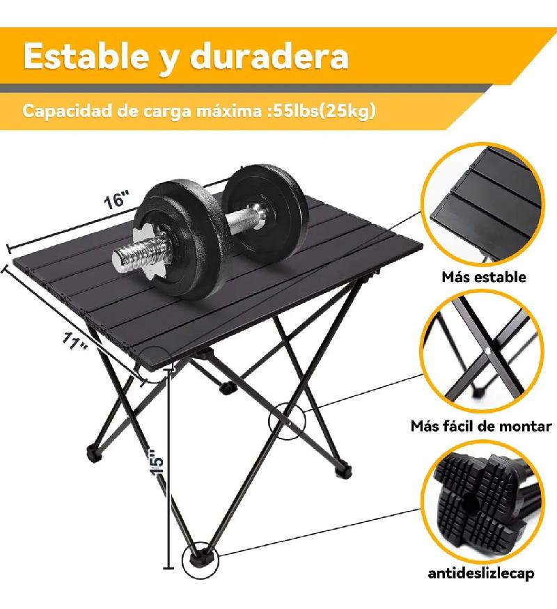 la mesa está hecha de aleación de aluminioy cada parte de la mesa está conectada con una cuerda reforzada de doble hebra que es de alta elasticidad y muy ajustada. El soporte de la mesa está hecho de aluminio reforzado y su diseño fijo en forma de X hace que la mesa de camping sea estable.