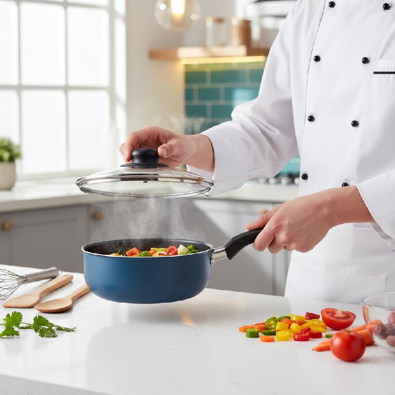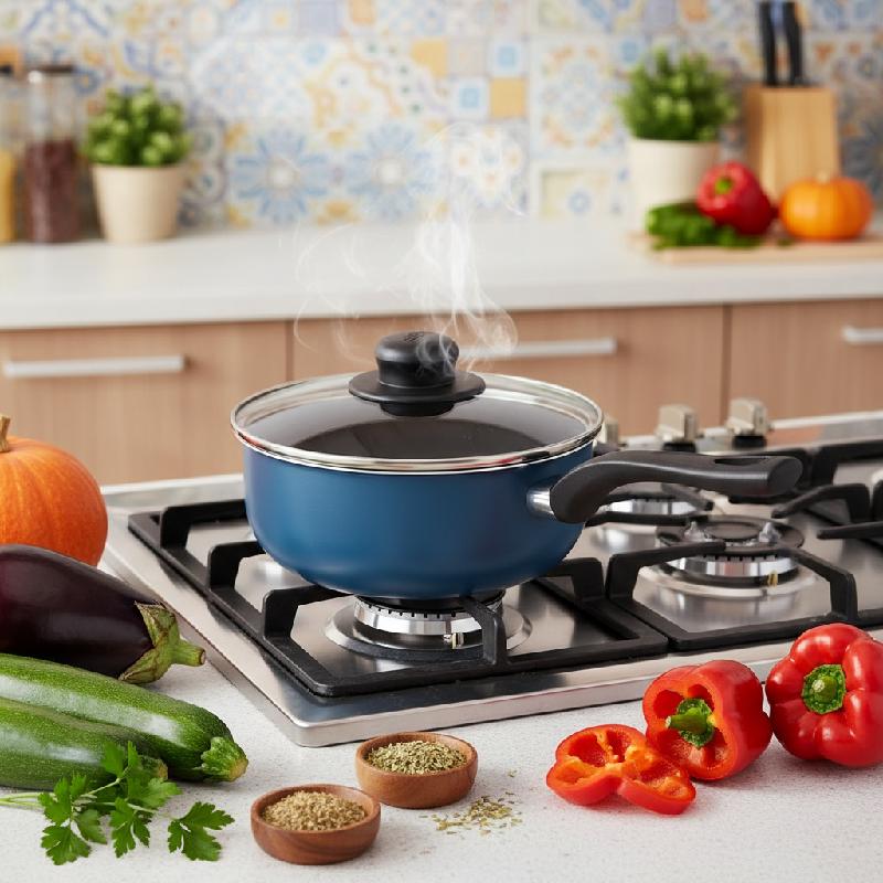 - Tapa de vidrio templado con pomo plástico que permite visualizar la cocción