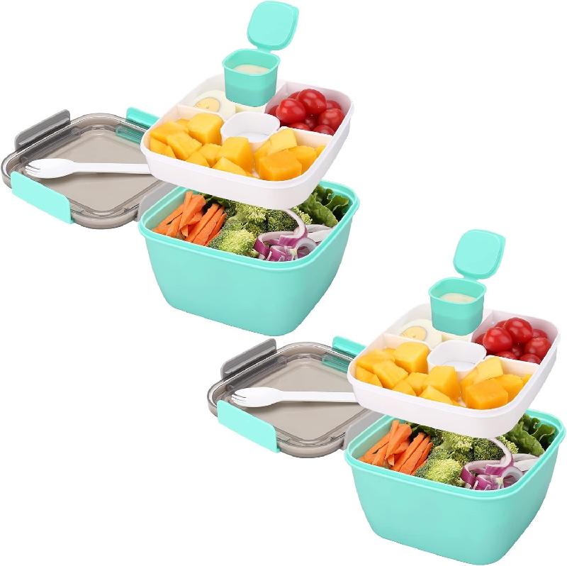 - Recipiente para ensaladas tipo bento con diseño de doble capa y bandeja interna de 3 compartimentos. Disponible en color rosado y menta.