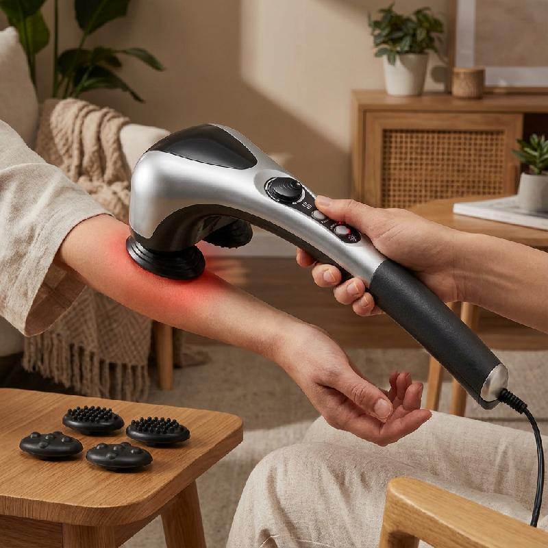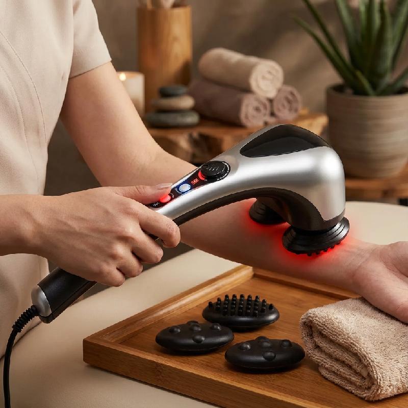 -Masajeador corporal térmico de doble cabeza con infrarrojo, ideal para bienestar y relajación en casa.