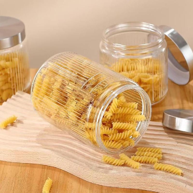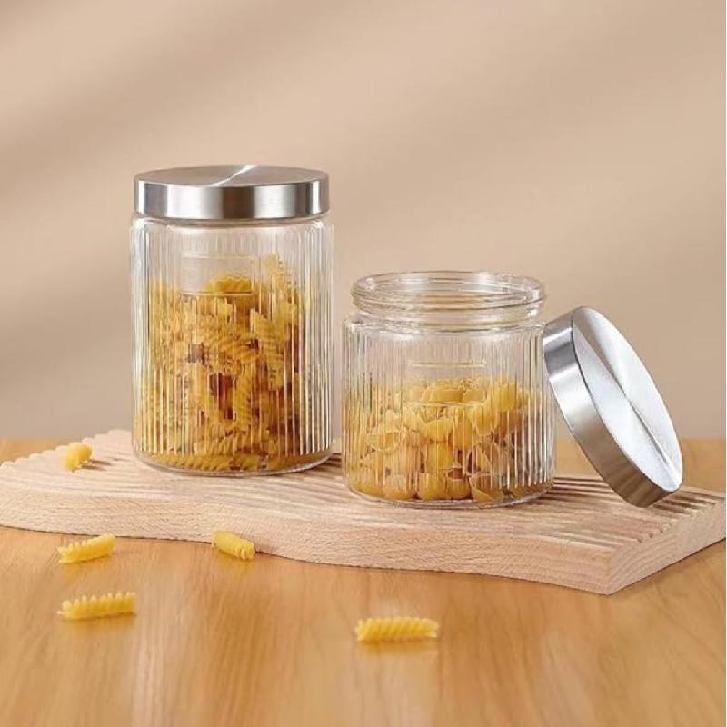 Características del producto: el tarro de vidrio cubierto de metal tiene un mejor diseño de sellado, con un diámetro de boca de 4.13 pulgadas para un fácil acceso a los artículos y una gran capacidad para almacenar más alimentos. El diseño de patrón vertical del cuerpo de la lata evita que las cosas se resbalen fácilmente.