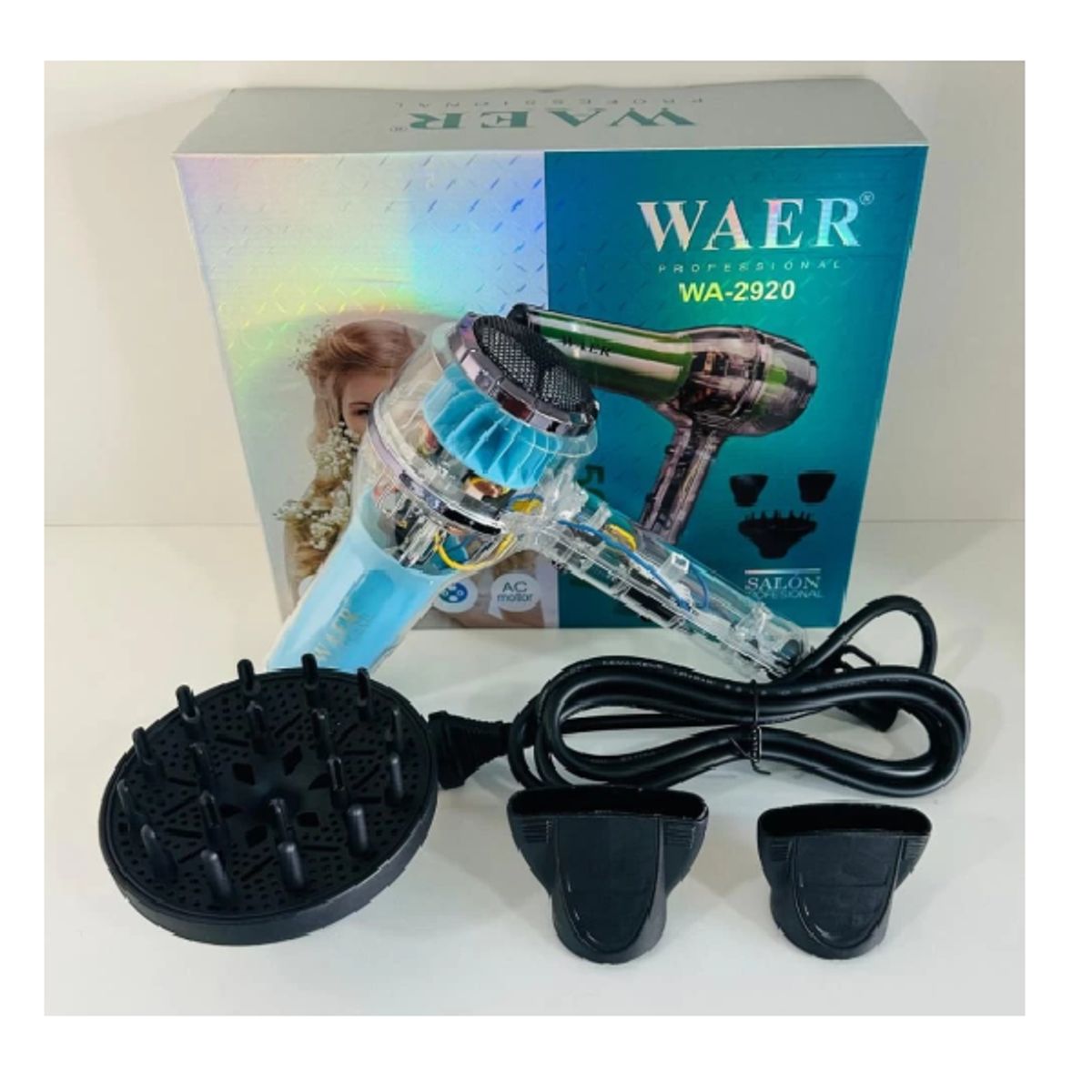 -Secador de cabello profesional WAER WA-2920 con potente motor AC de 5000W para un secado rápido y eficiente.