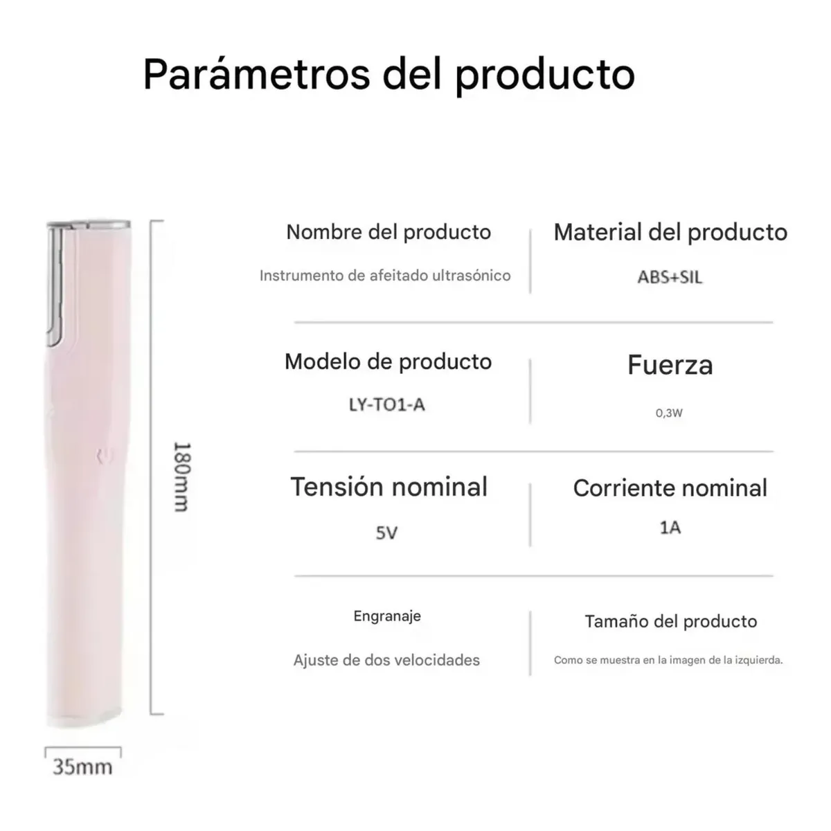- Depilador Ultrasónico Femenino Portátil Ultrasonic Shaver Pro+ diseñado para dermaplaning facial, ideal para lograr una piel suave, uniforme y luminosa desde casa.