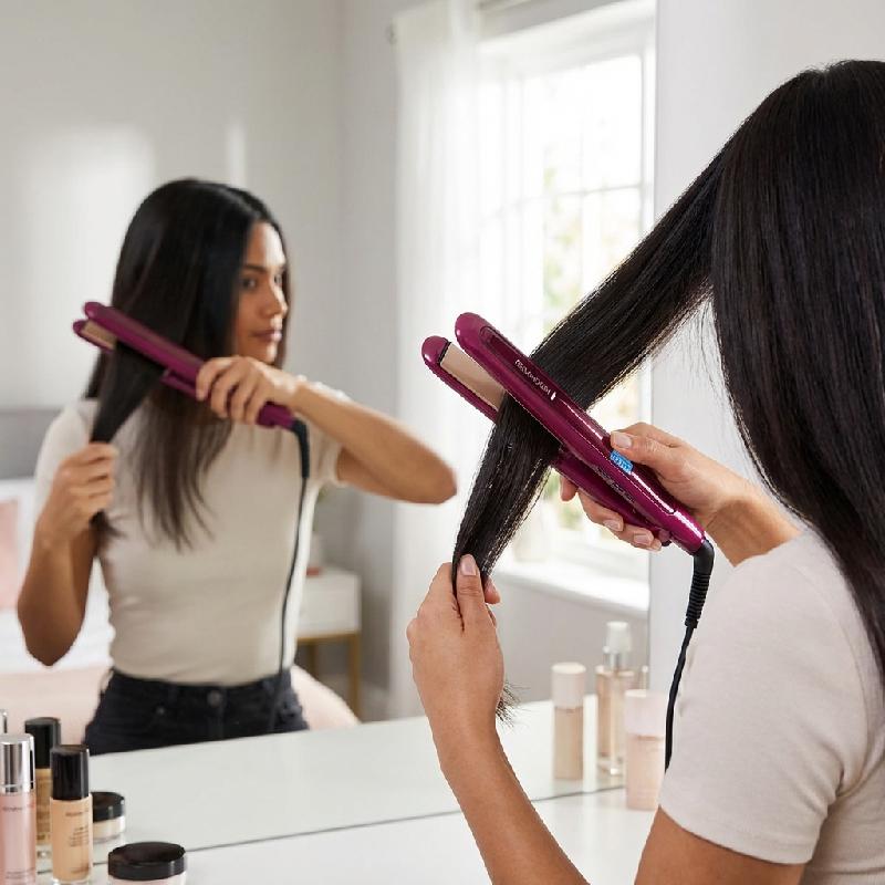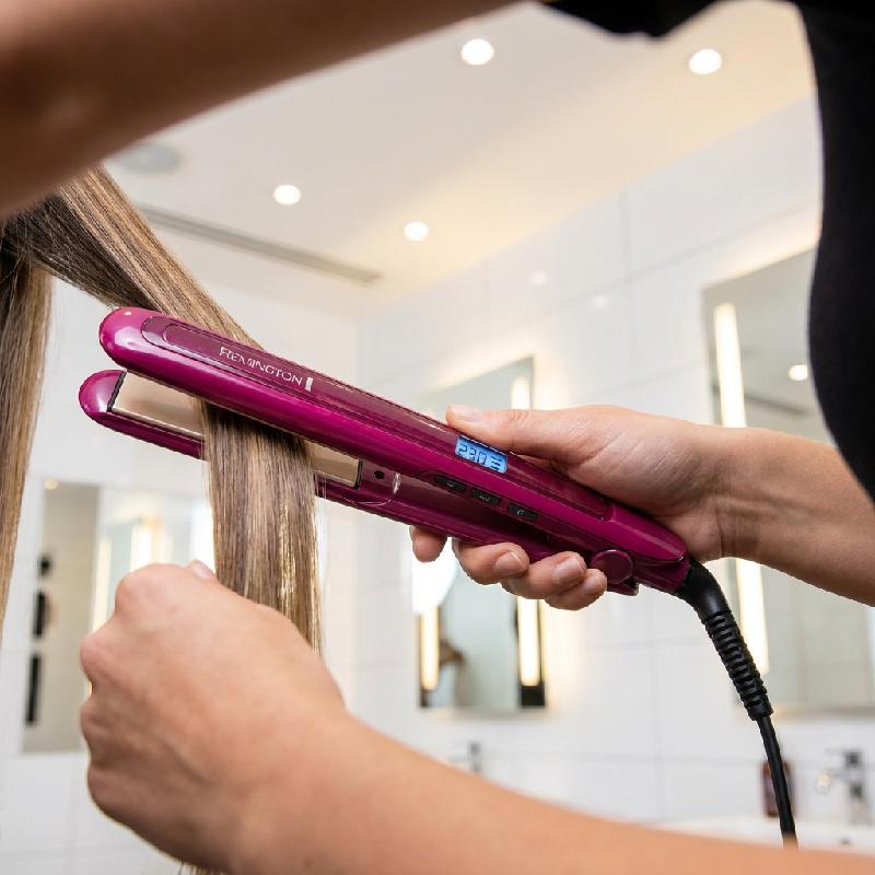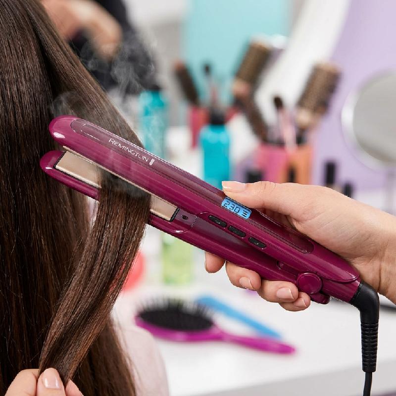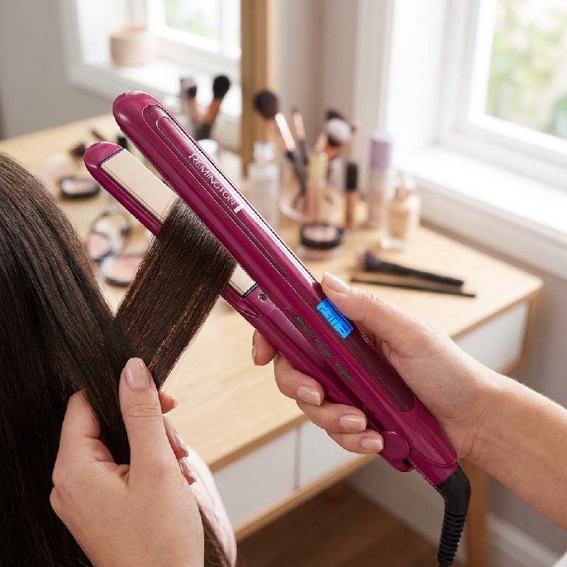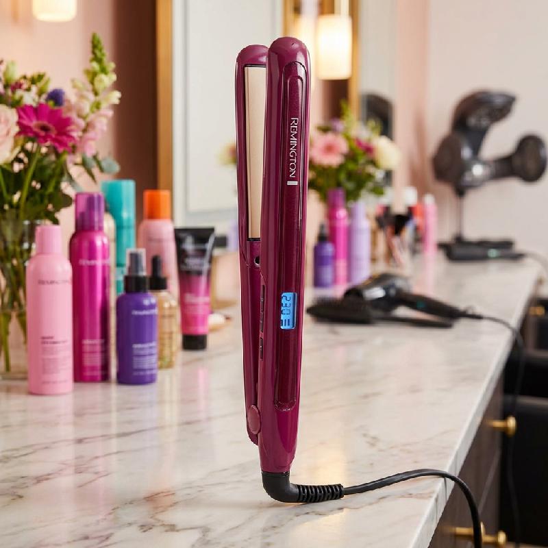 - Plancha alisadora Remington Triple Infusión™ con keratina, aceite de argán y macadamia para un cabello más fuerte, brillante y sedoso.