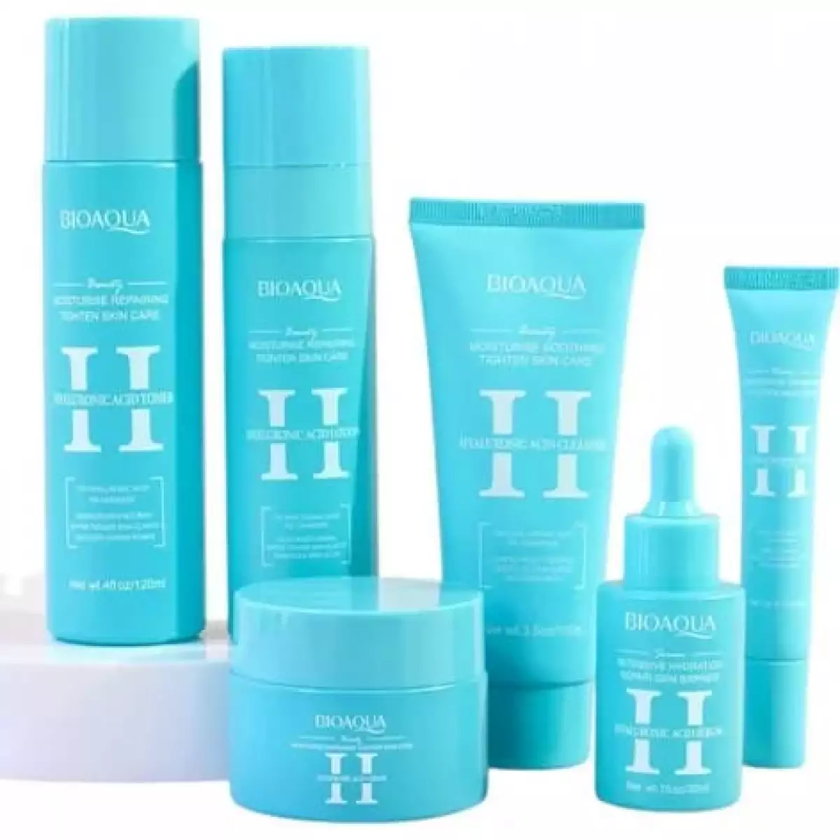 - Kit facial BIOAQUA con ácido hialurónico x6 pasos, diseñado para cubrir la rutina completa de cuidado diario del rostro: limpieza, hidratación profunda, reparación y sellado de la humedad.