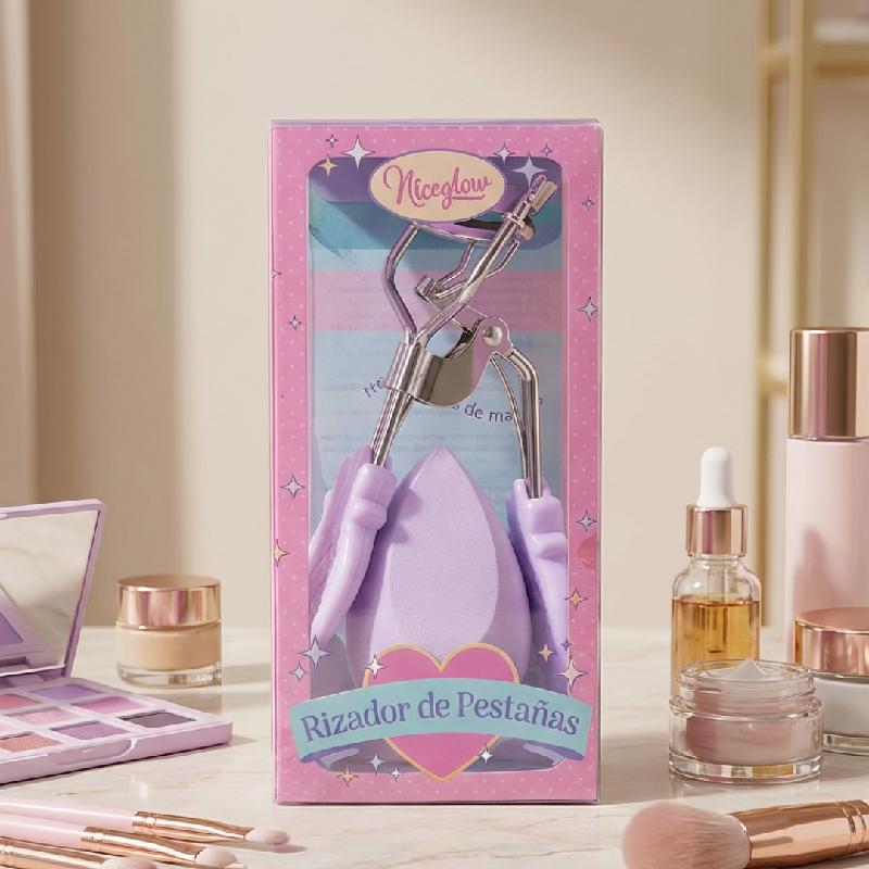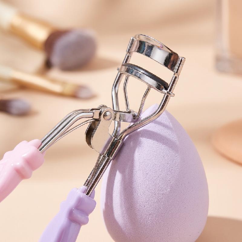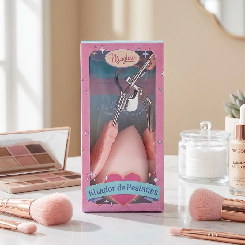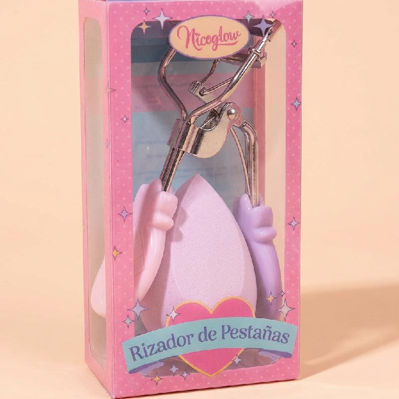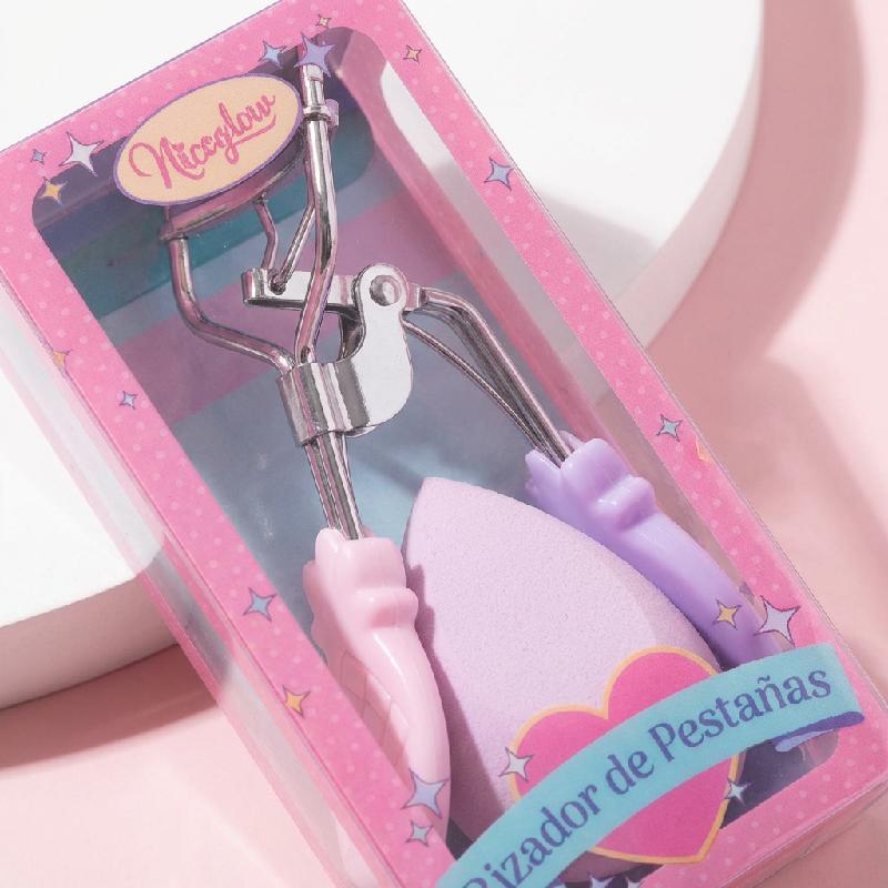 Se trata de un rizador de pestañas manual con mango ergonómico y almohadilla de silicona blanca para un rizo suave sin dañar las pestañas. Incluye una esponja para maquillaje (beauty blender) unida al kit, ideal para aplicación uniforme de base o corrector.