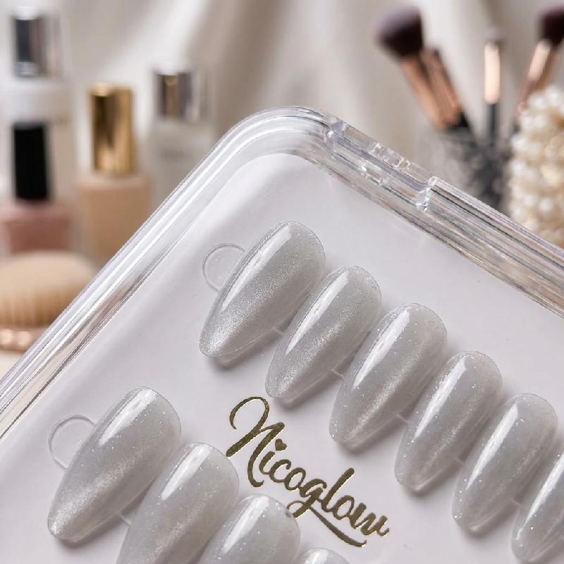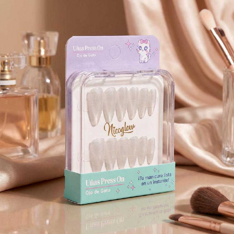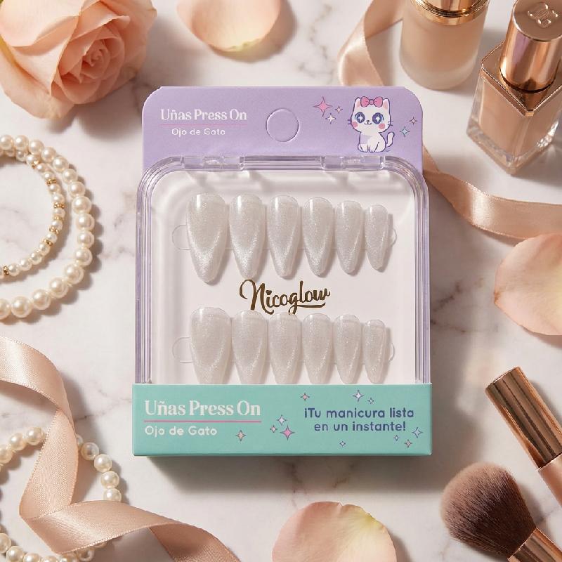 Color y Efecto: Blanco Efecto / Blanco Press On con Ojo de Gato (brillo magnético cambiante, activado por imán en su fabricación).