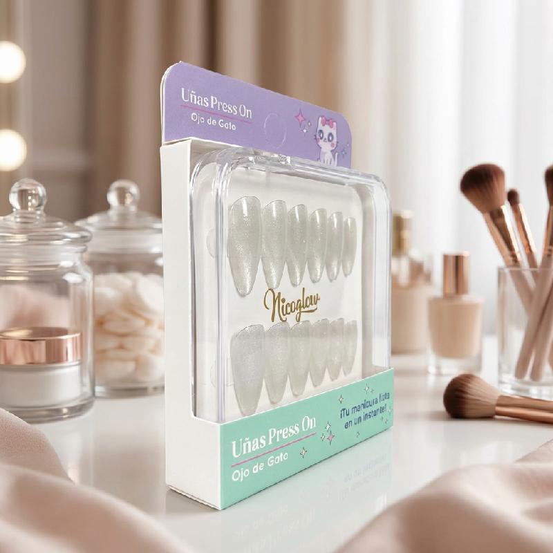 Son uñas artificiales listas para pegar con efecto "ojo de gato" (cat eye), un acabado magnético brillante que cambia con la luz, en tono blanco translúcido o efecto espejo.
