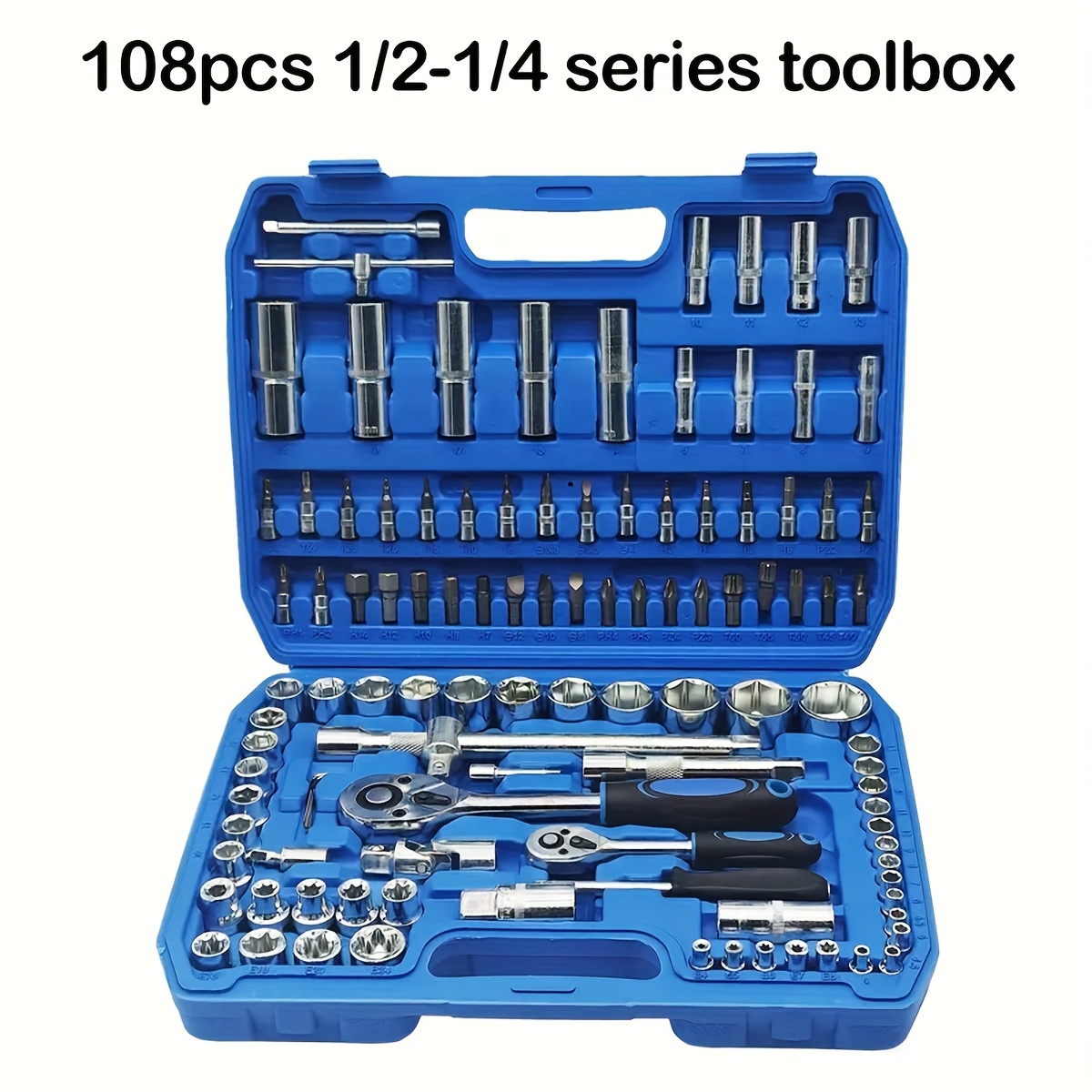 - Incluye un total de 108 piezas, presentadas en caja plástica de transporte; el color del estuche se envía según disponibilidad (naranja, azul o negro).