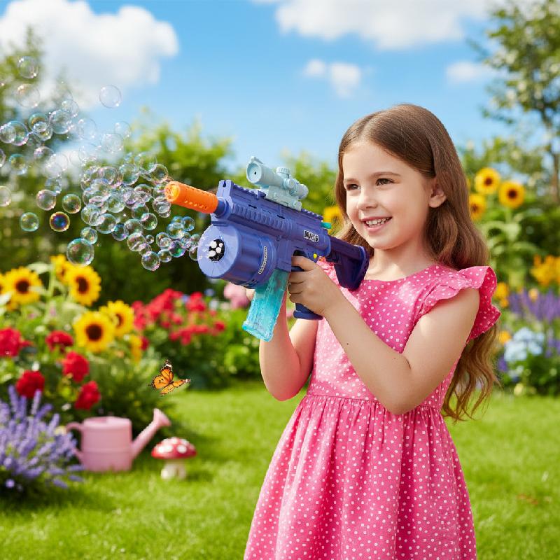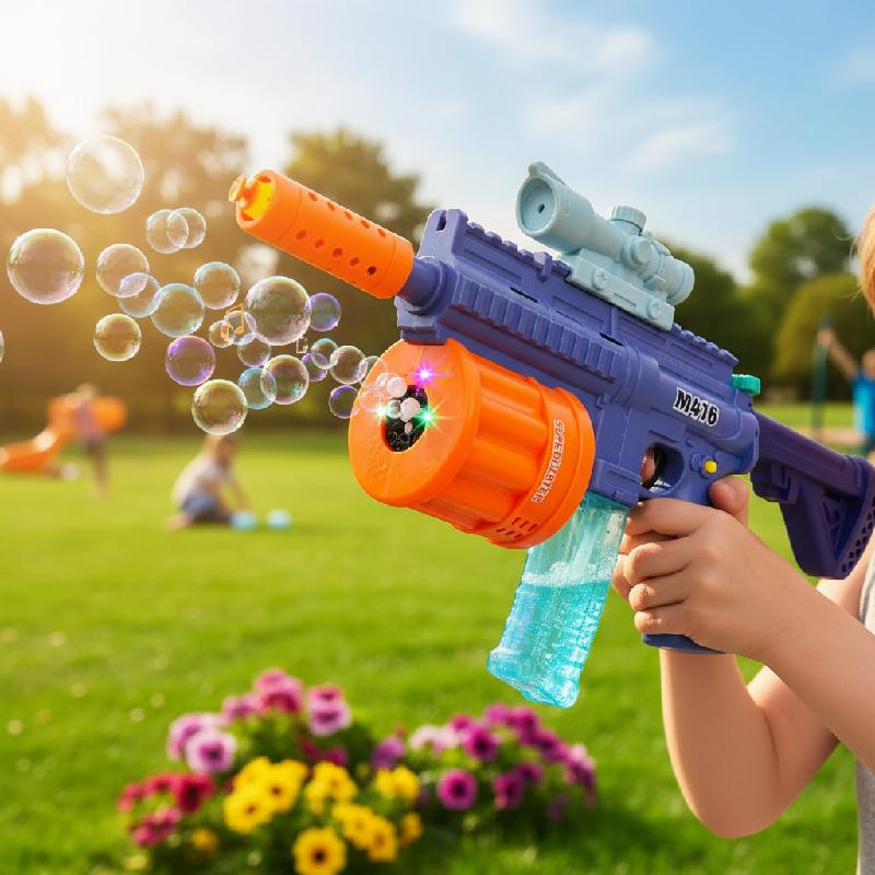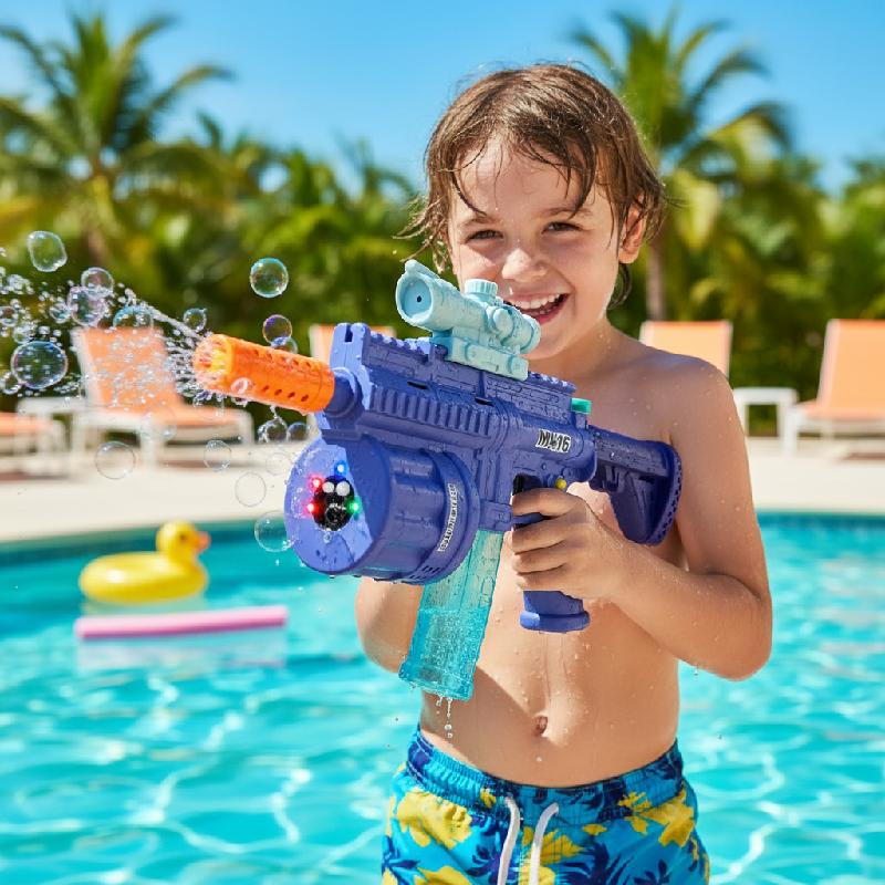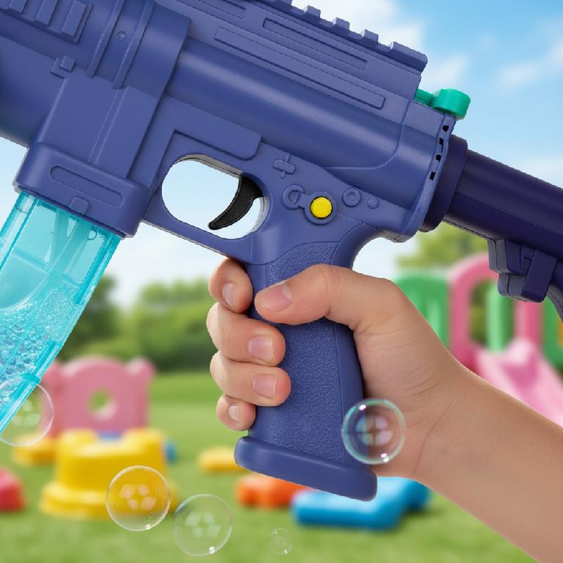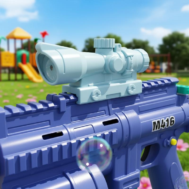 - Juguete multifuncional 3 en 1 tipo M416 que combina ametralladora de burbujas, pistola de balas blandas y lanzador de dardos con burbujas.