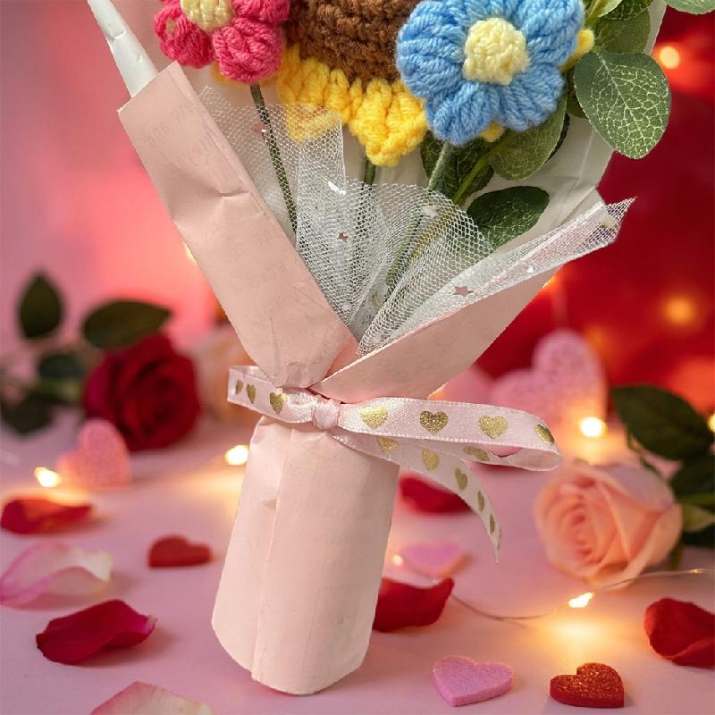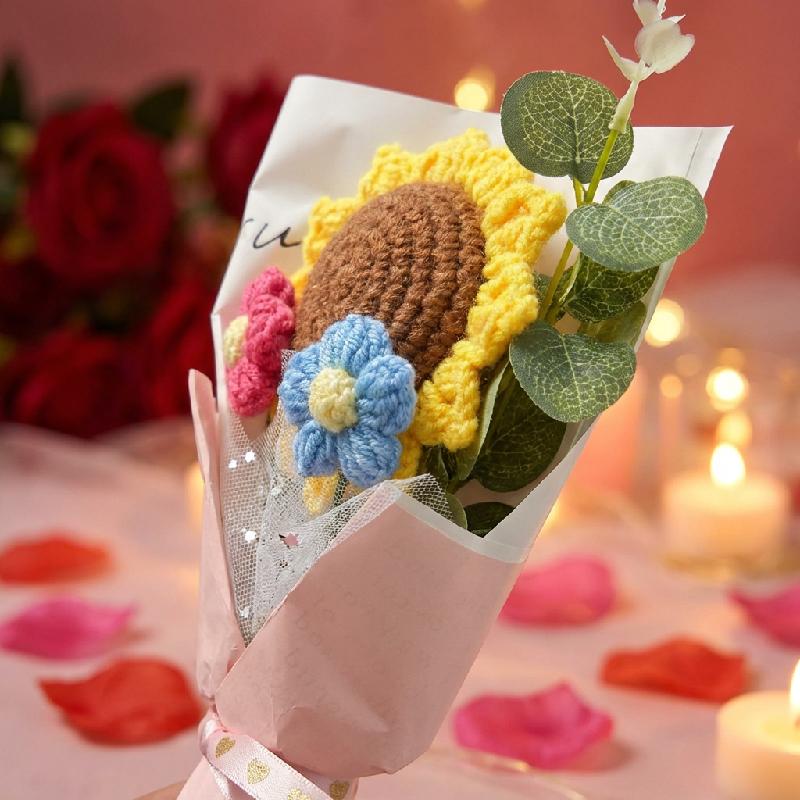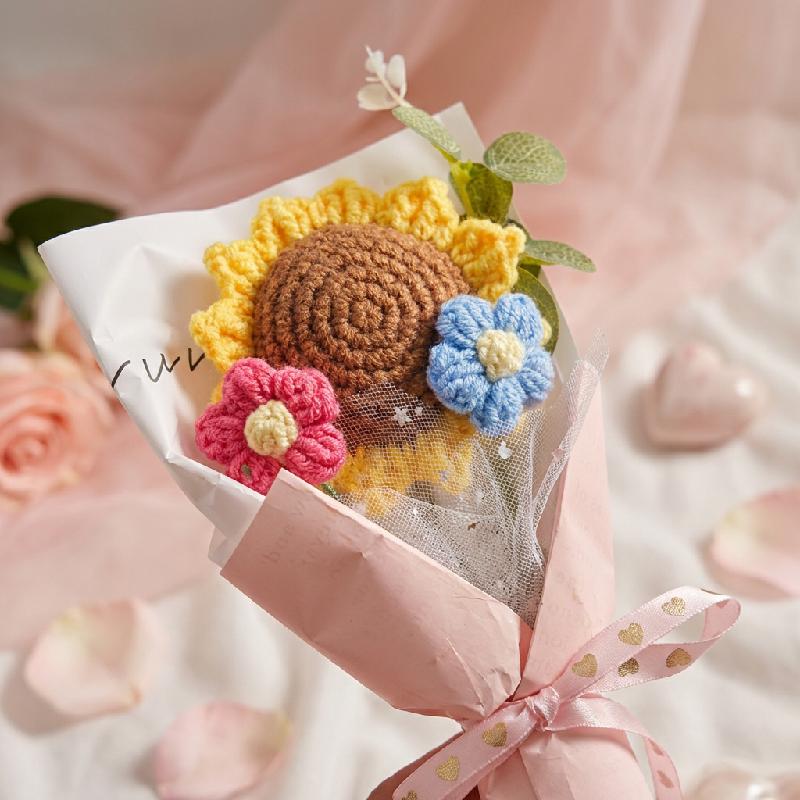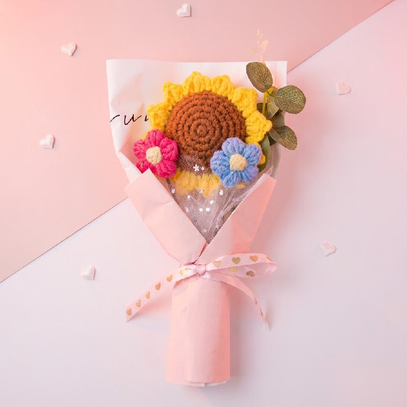 bouquet artesanal eterno hecho con hilo de algodón suave de alta calidad, incluyendo un girasol principal marrón y amarillo crochet, una flor pequeña rosa y blanca, hojas verdes y envoltura en papel tisú con cinta satinada rosa.
