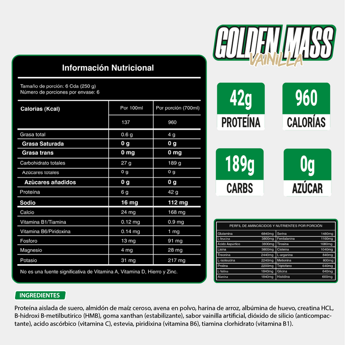 - Proteína hipercalórica formulada para apoyar el aumento de peso y el desarrollo de masa muscular en personas con metabolismo rápido o dificultad para subir de peso.