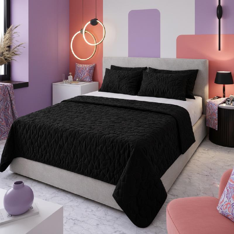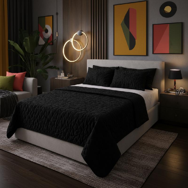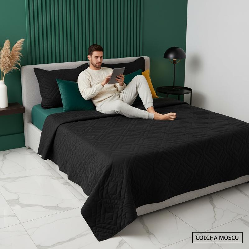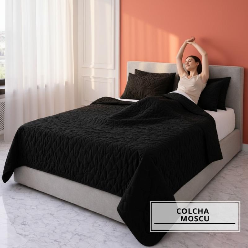 - Colcha MOSCU elaborada en microfibra ultra suave, con diseño elegante en color negro y acabado acolchado moderno.