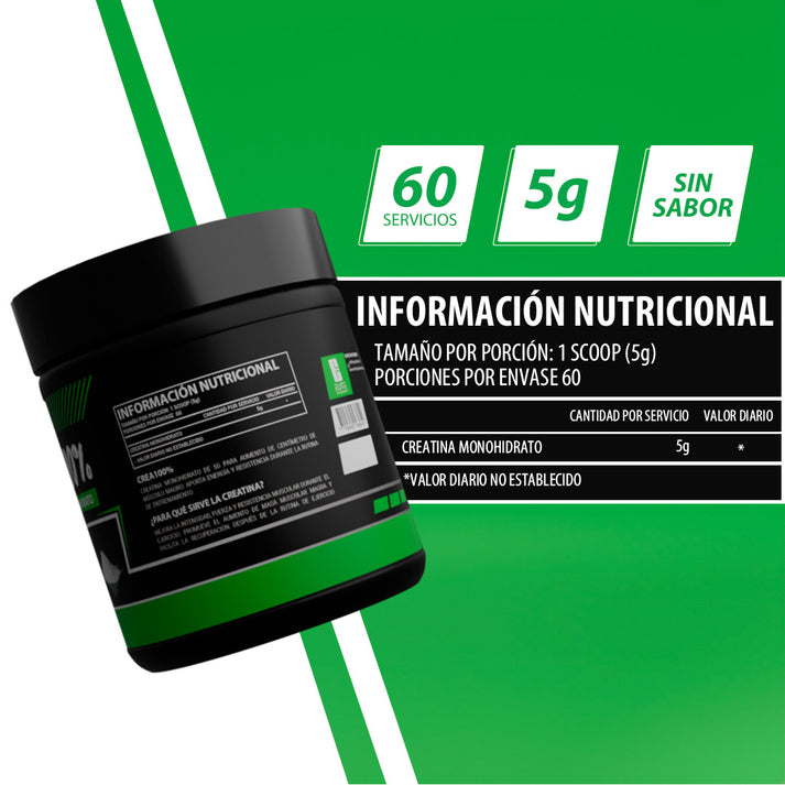 - CREA100% Creatina Monohidrato Pura diseñada para mejorar el rendimiento físico, aumentar la fuerza y apoyar el desarrollo de masa muscular.