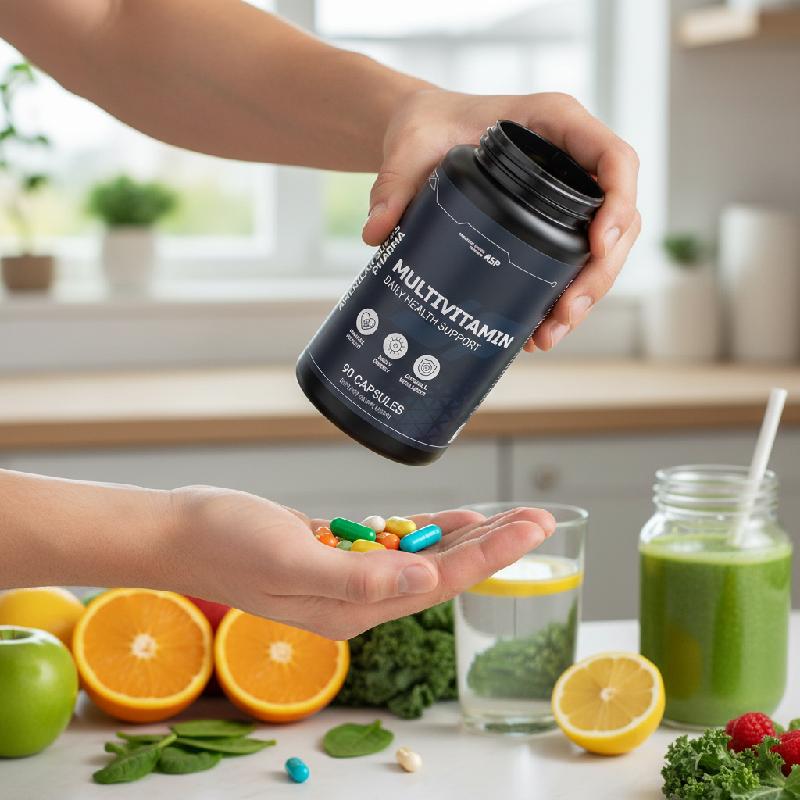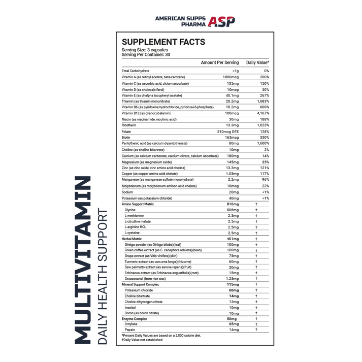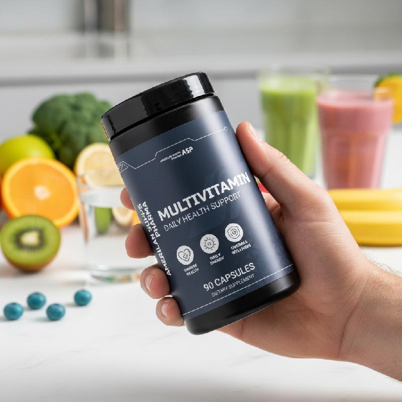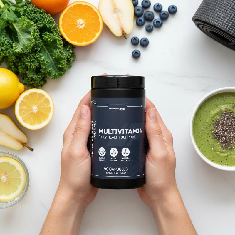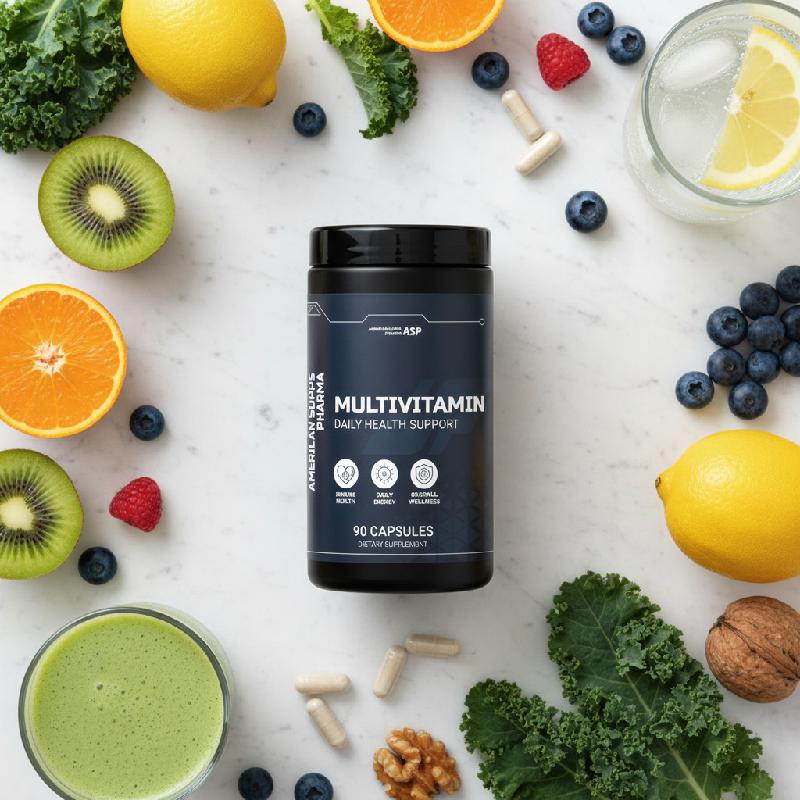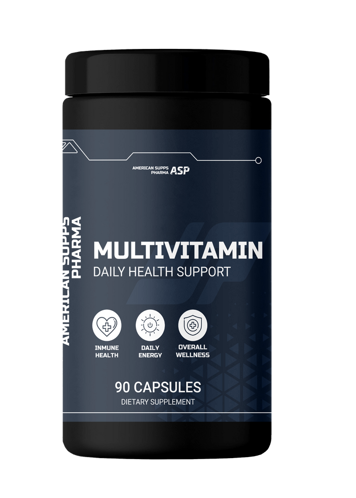 - Multivitamínico American Supps Pharma formulado para apoyar la salud general, la energía diaria y el rendimiento físico.