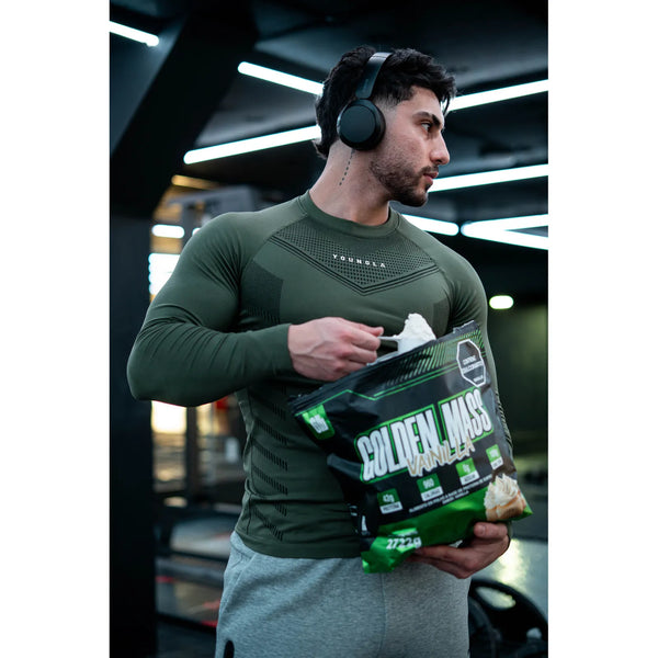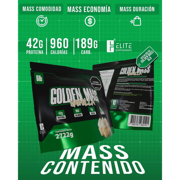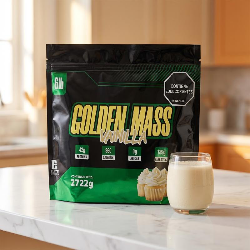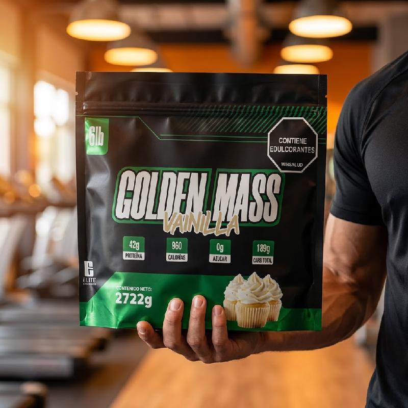 - GOLDEN MASS Elite Supplements, proteína hipercalórica diseñada para subir de peso y aumentar masa muscular.