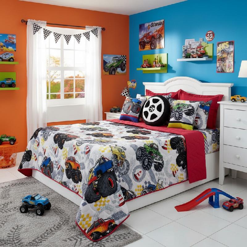 - Juego de cubrecama infantil con diseño vibrante y estampado temático que aporta un estilo moderno y llamativo a la habitación.