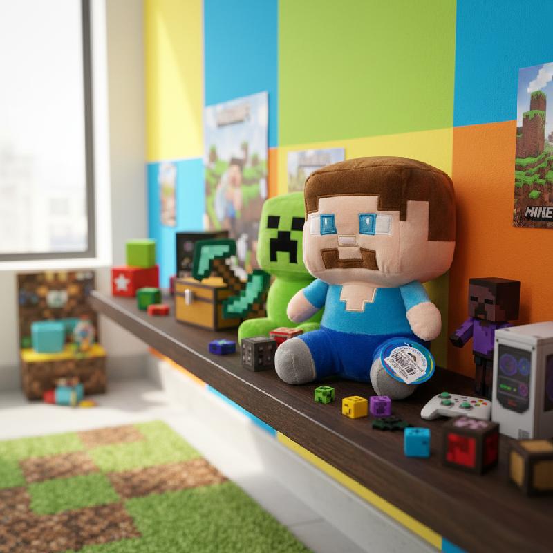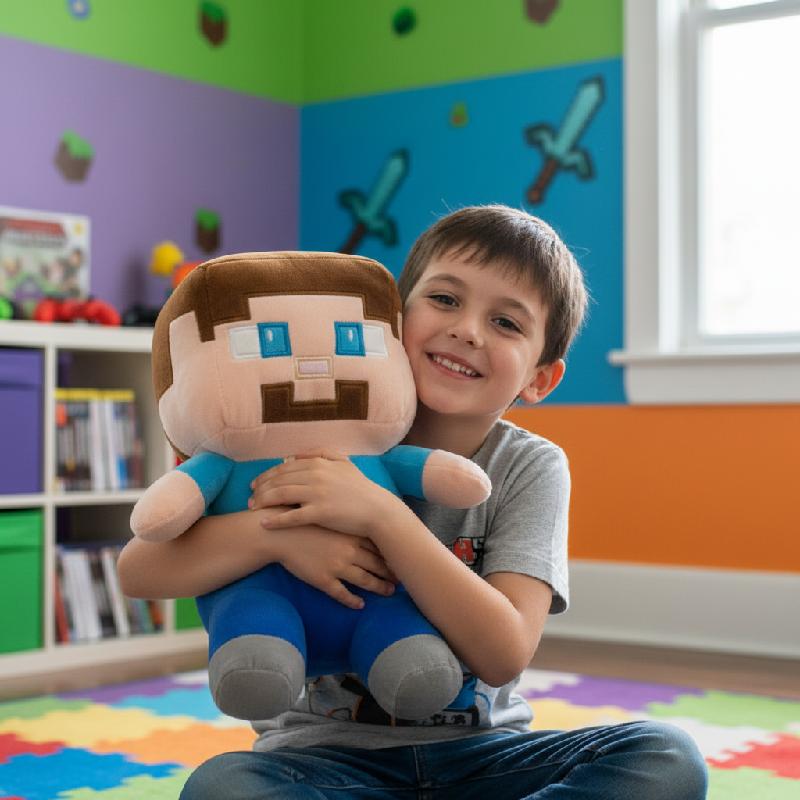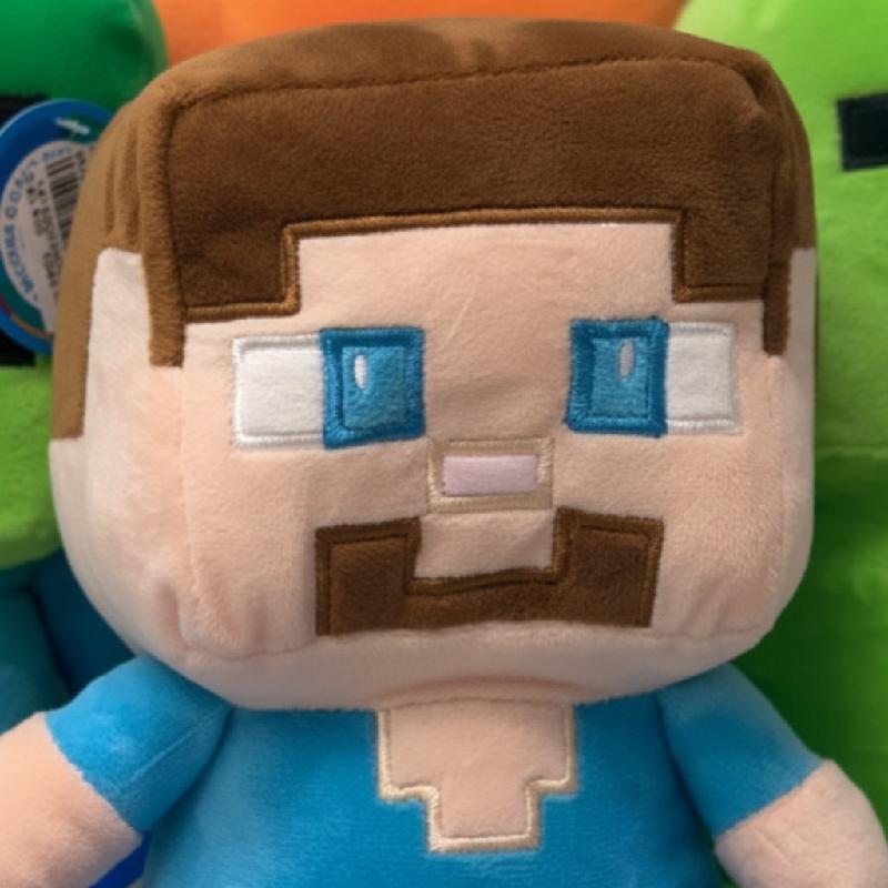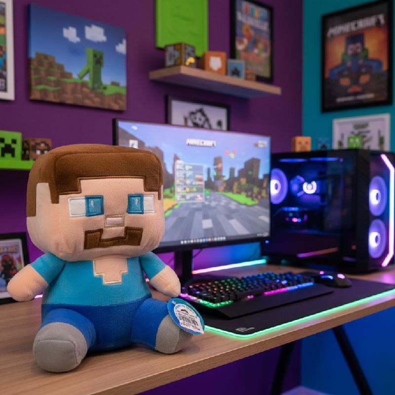 - Peluche de Steve inspirado en popular videojuego, con diseño pixelado y detalles bordados.