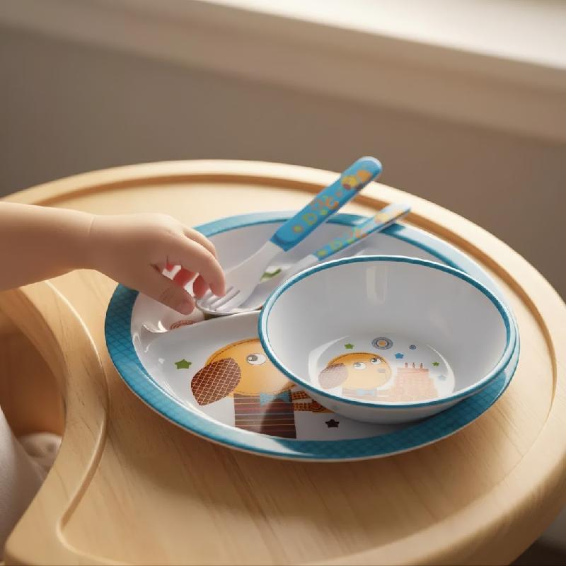 Tazón y cubiertos: Tazón ~10-12 cm diámetro; cubiertos cortos para manos pequeñas. Apto para microondas, lavavajillas (estante superior) y congelador.