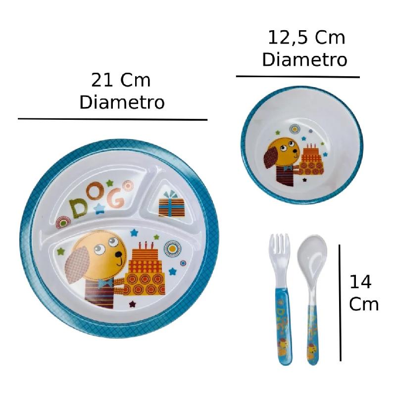 Componentes: Plato dividido (sección principal con guisantes y verduras, áreas para dips), tazón redondo con motivos de perritos y pastel, tenedor y cuchara con mangos ergonómicos en forma de perro.