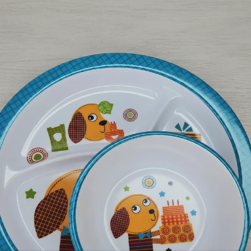 Diseño: Compartimentos separados para evitar mezclar alimentos; succión base antideslizante que se adhiere a bandejas de tronas; decoración temática de cumpleaños con perros antropomórficos.
