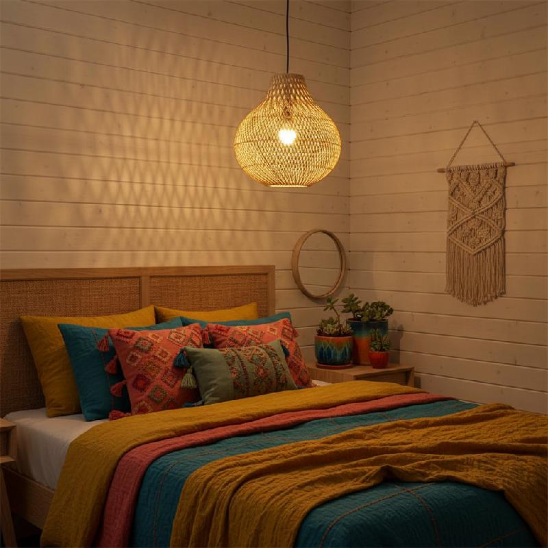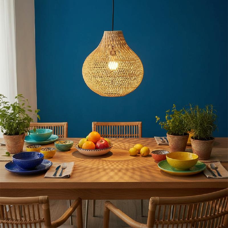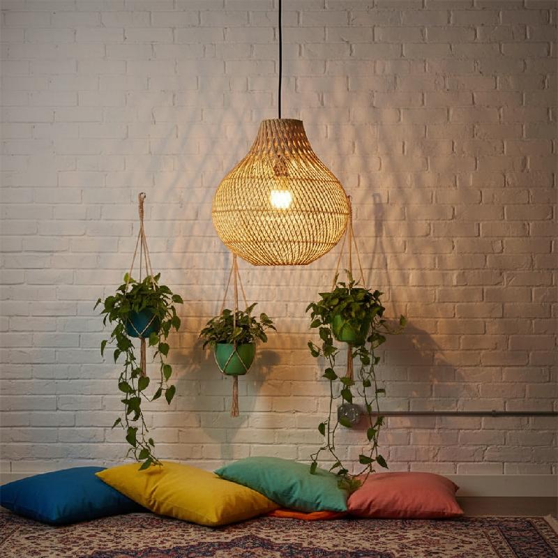- Pantalla de mimbre rústico elaborada en ratán seleccionado, aportando un estilo ecléctico, boho o tipo granja con un ambiente cálido y acogedor.