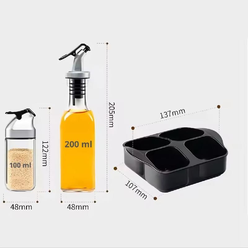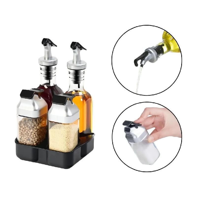 Organizador de especias de 4 tarros para encimera, recipientes de condimentos de vidrio con botella dispensadora de aceite de oliva y tarros de especias de hierbas para almacenar líquidos y sólidos en la cocina especias no incluidas.