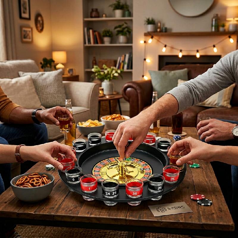 - Ruleta de shots tipo juego de mesa diseñada para animar reuniones y fiestas con amigos de una forma divertida y dinámica.