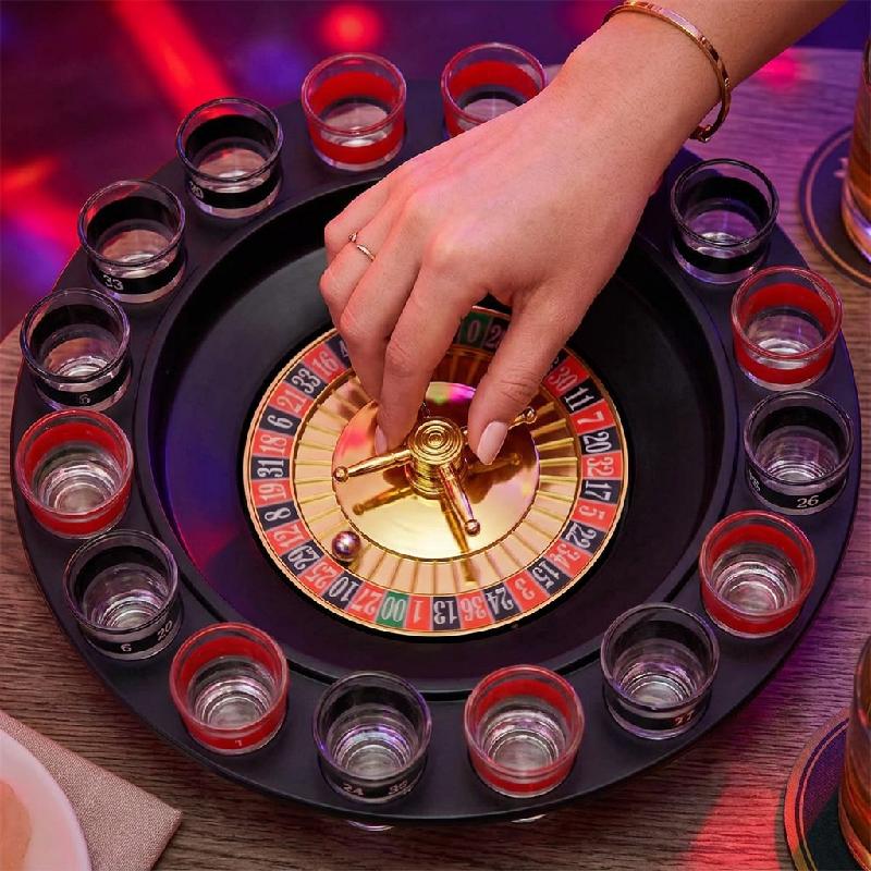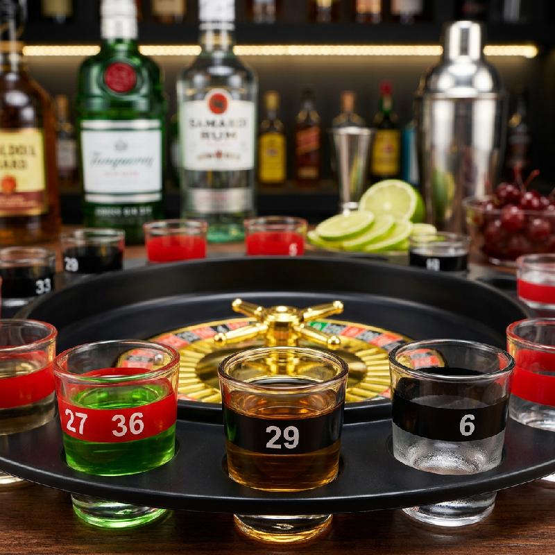 - Incluye 16 vasos numerados de vidrio con capacidad aproximada de 15 ml que se colocan alrededor de la ruleta.