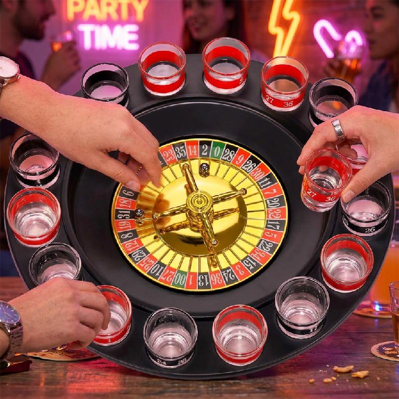 - Incluye: 16 mini vasos de vidrio, 2 esferas metálicas y 1 rueda de ruleta con orificios para los vasos.