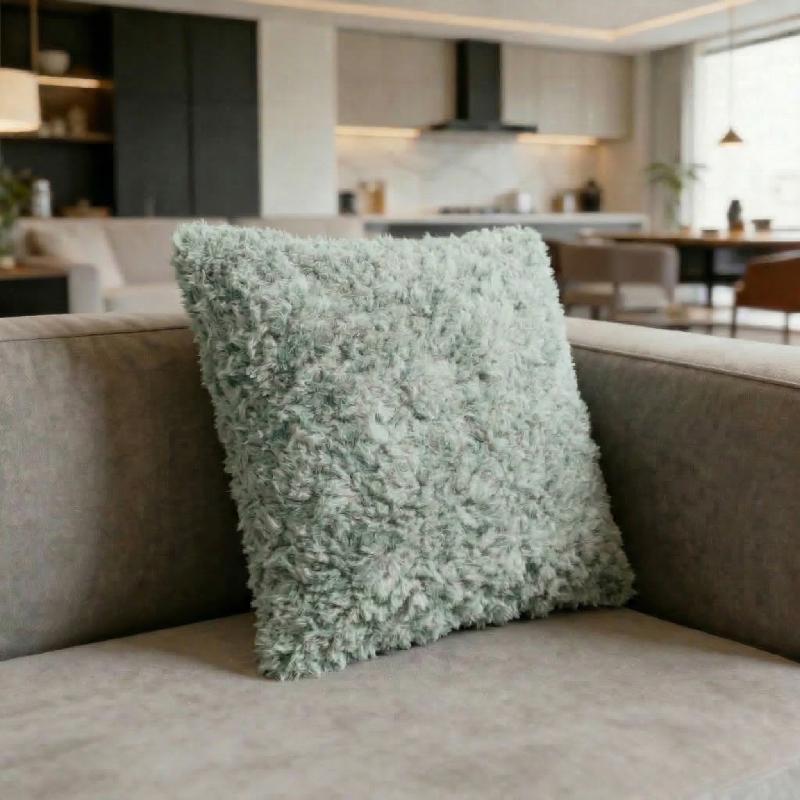 Funda de cojín cuadrada de pelo verde, con textura esponjosa y uniforme.
