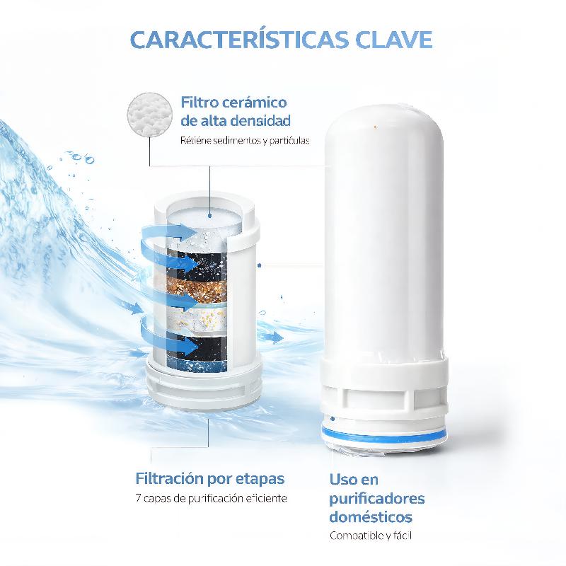 Fabricado en cerámica filtrante de alta densidad, diseñada para retener contaminantes sólidos y prolongar la vida útil del sistema de purificación.