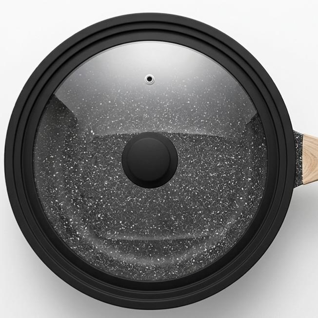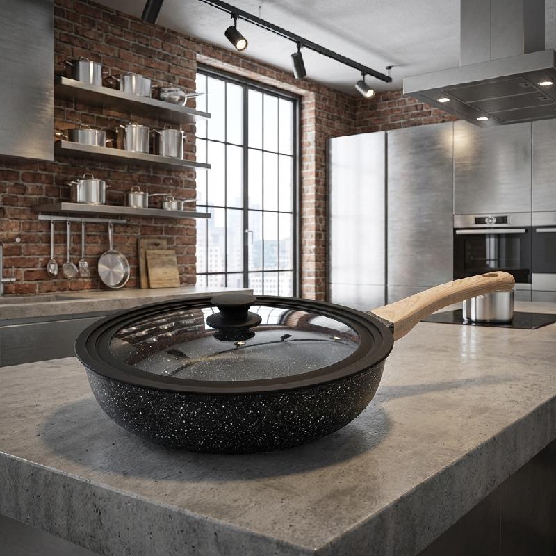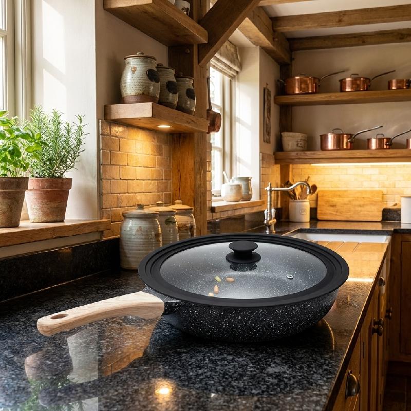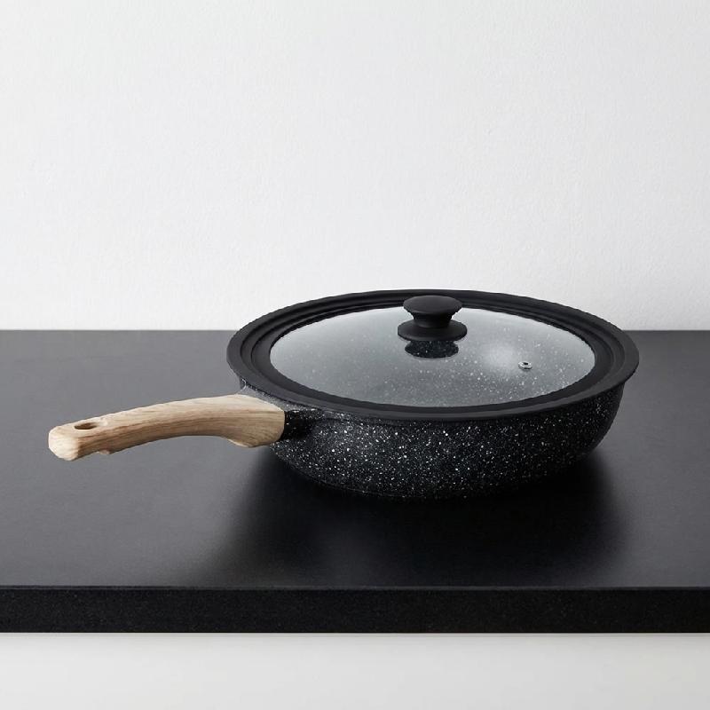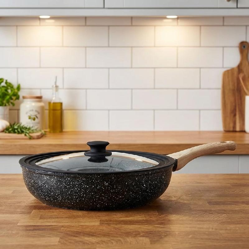 SARTEN ANTIADHERENTE EFECTO PIEDRA CON TAPA VIDRIO MANGO MADERA MULTICOCINAL JS24CM