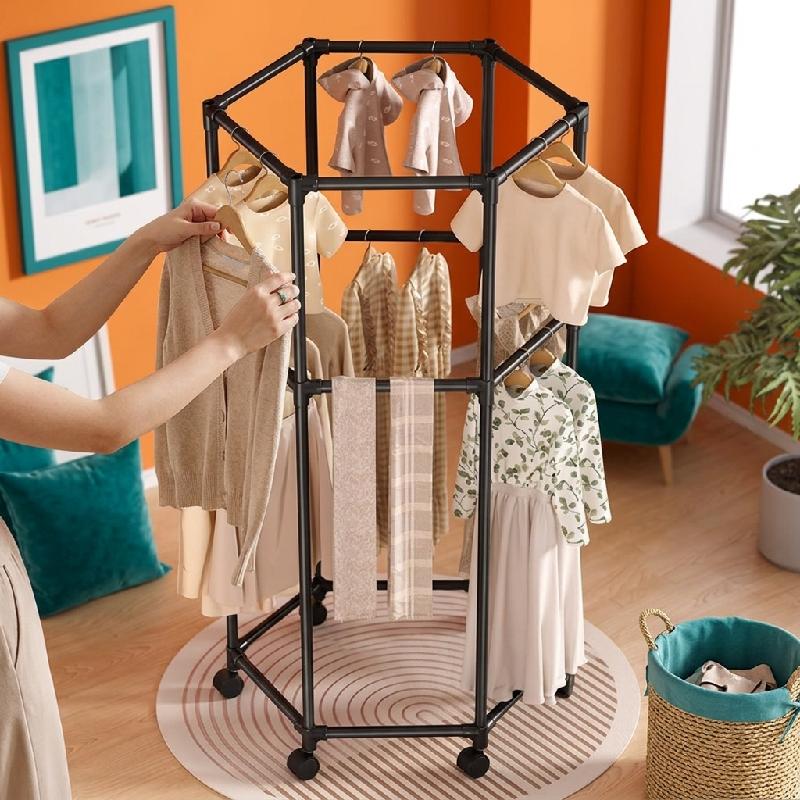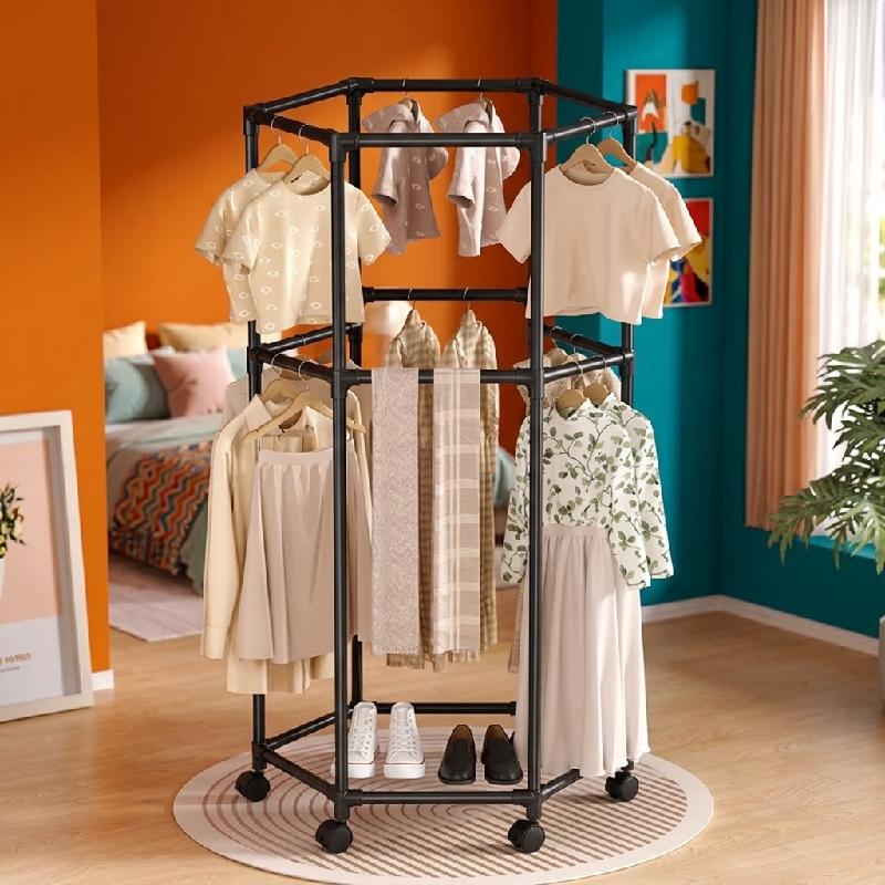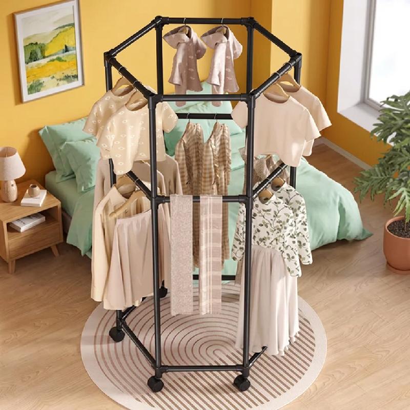 Perchero giratorio hexagonal de doble capa para ropa de pie para interiores, multifuncional, tendedero de ropa móvil adecuado para el hogar y el dormitorio.