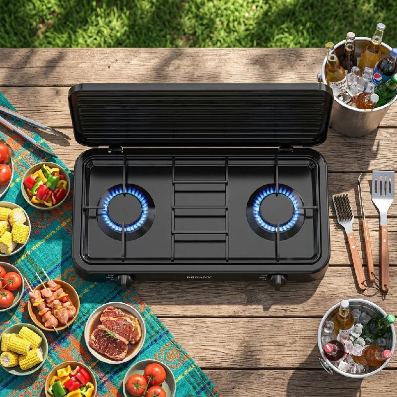 - Cocineta de gas de 2 hornillas con diseño compacto y moderno ideal para cualquier espacio.