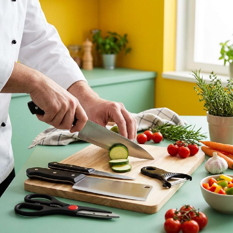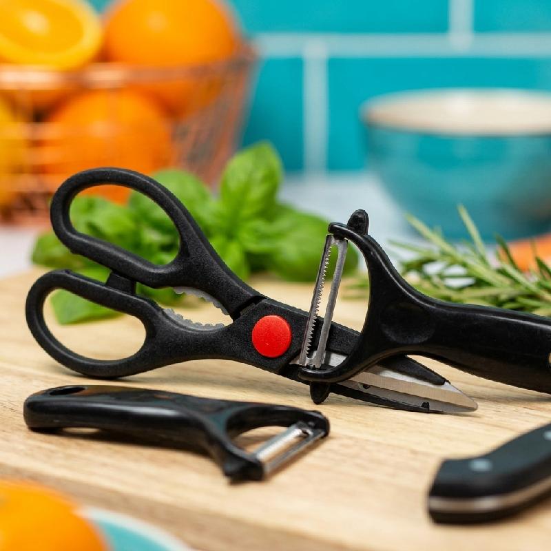 — Contenido: tijera, pelador de papas, 2 cuchillos y cuchillo chef — 5 piezas en total